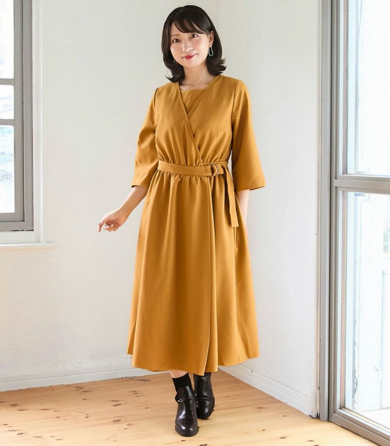 ウエストのベルトがポイントのワンピース。すっきりときれいなシルエットで着ていただけます。ウールライクのきちんと感のある生地で、フォーマルシーンにも◎ フレアーな七分袖で、秋〜春まで長い期間活躍する1枚です。