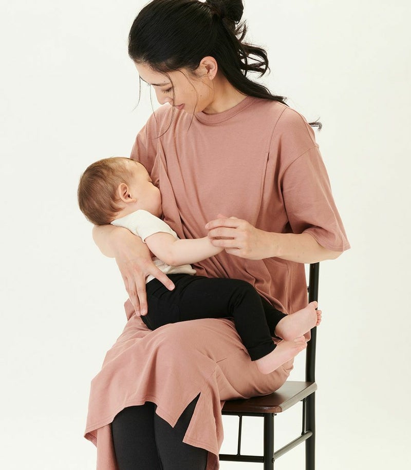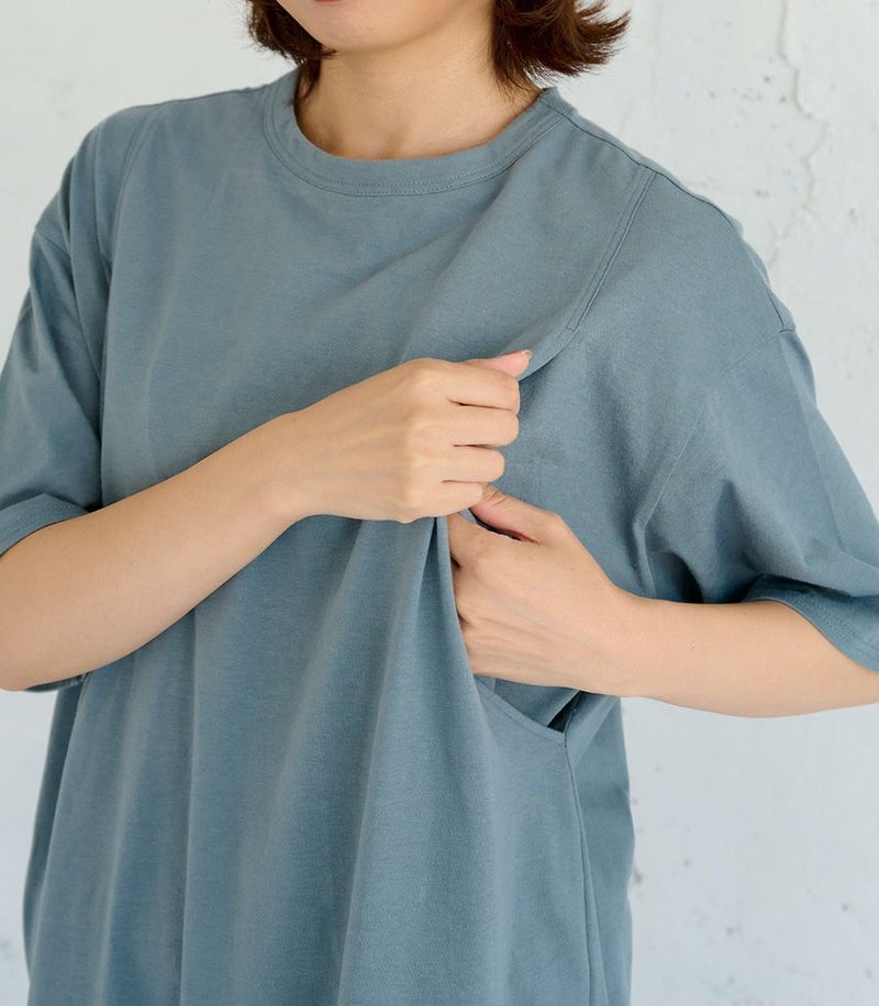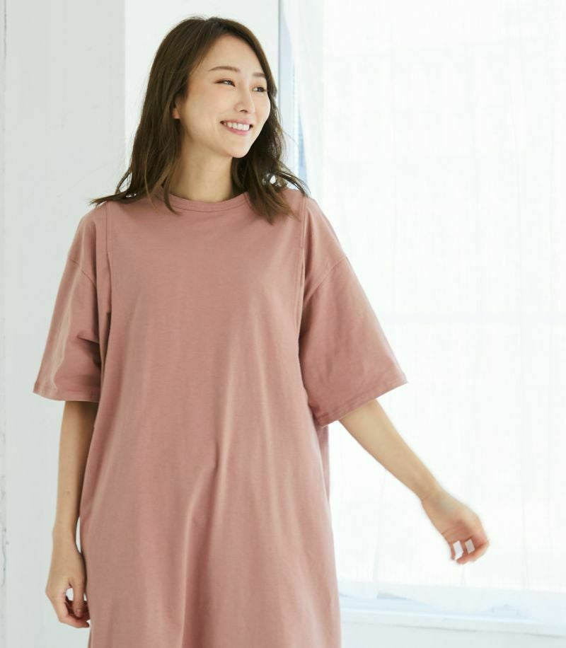 1枚で着られる便利なTシャツワンピース。コットン100%素材はお洗濯に強く、デイリー使いにぴったり。ゆったりとした着心地でお家でもお外でも活躍します。 〈生産国:日本〉 〈マタニティ(腹囲100cm)対応授乳服〉 まるいお腹を優しく包み込み、妊婦さんがきれいに見えるシルエット。産後には、ゆったり着られるのに、きれいなシルエットを保てるよう、試行錯誤を繰り返して完成しました。もちろん、授乳のしやすさにも自信があります。 〈素材:綿100%〉 しわになりにくく扱いやすいカットソー素材。綿100%なのでたくさんお洗濯しても安心。 〈洗濯表記:洗濯機OK/※アイロン時あて布を使用〉