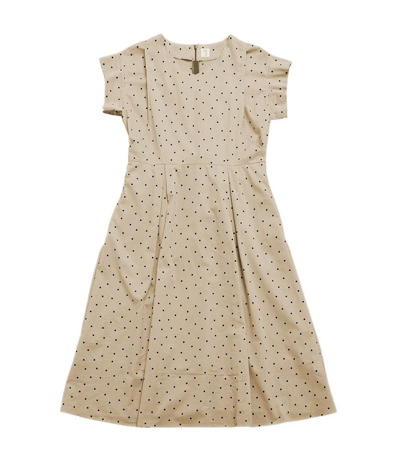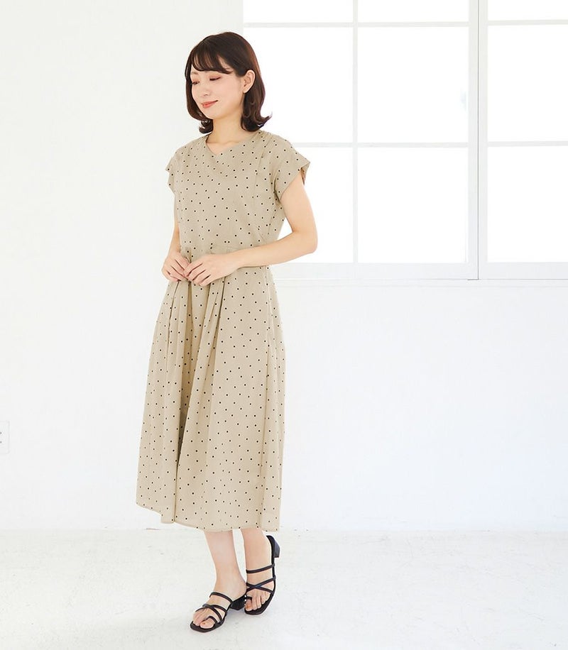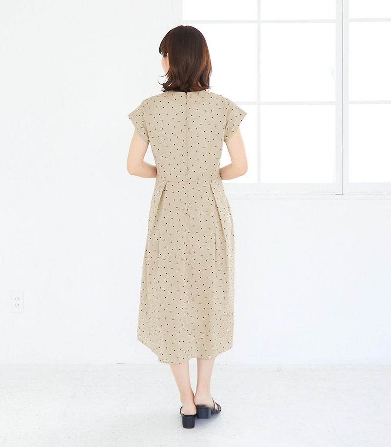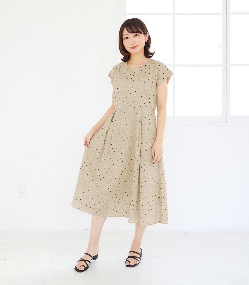 産後すっきりしない体型ですが、このワンピースを着ると痩せて見えます。ベージュのドット柄もかわいいです。