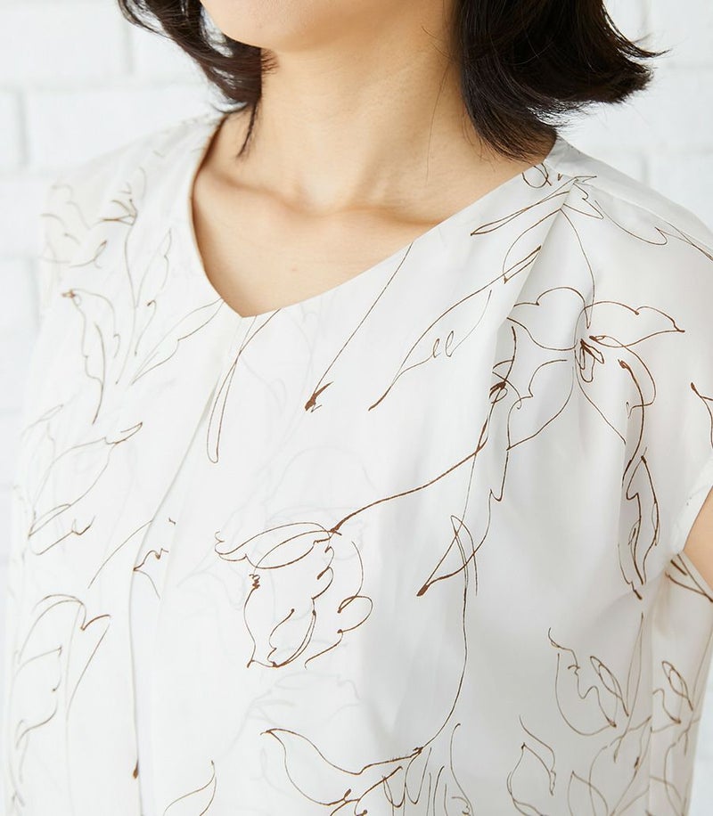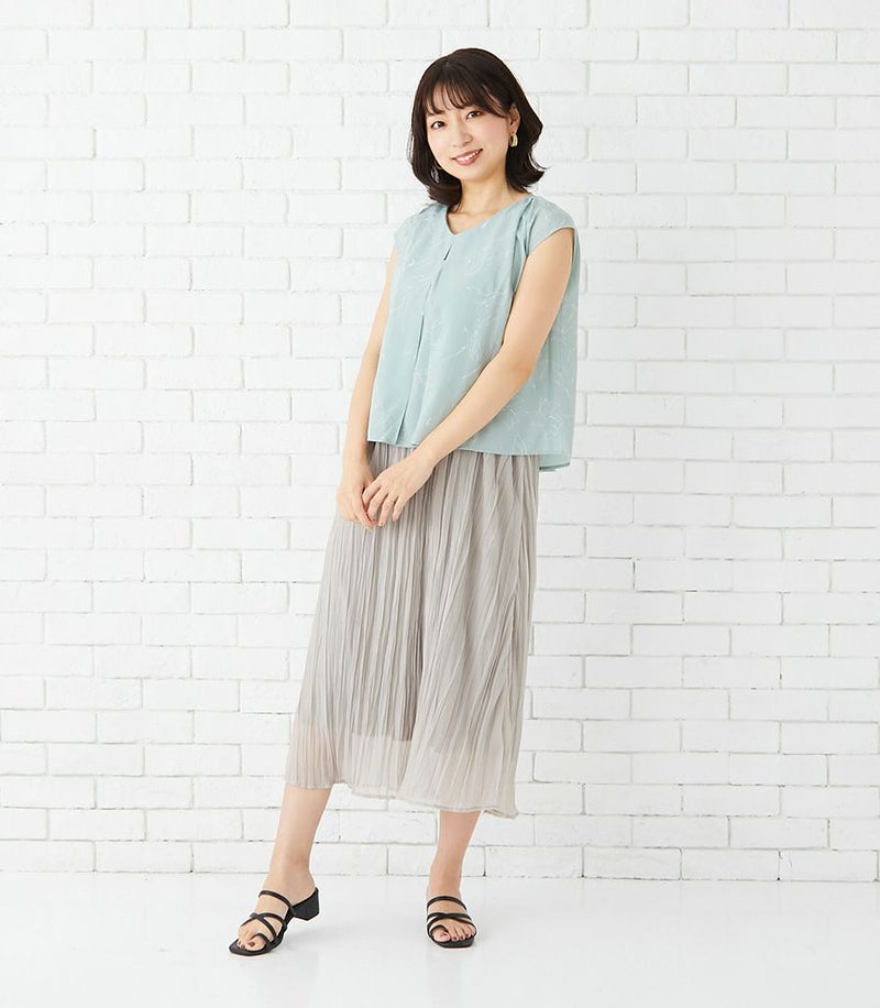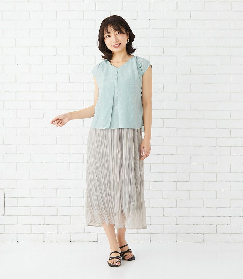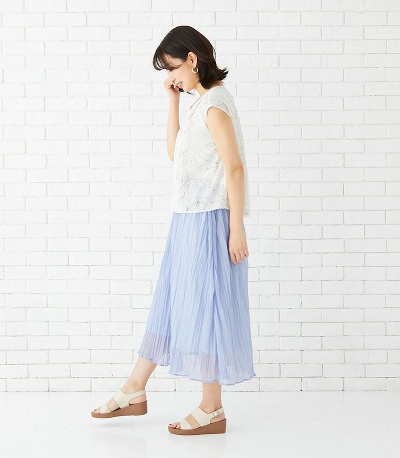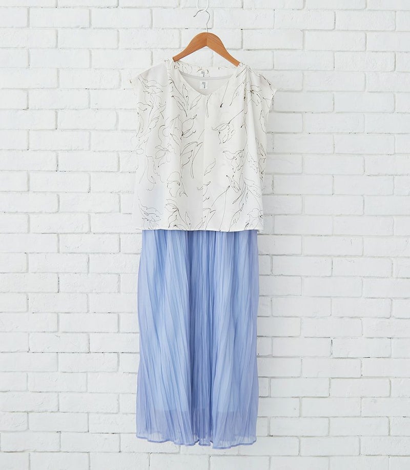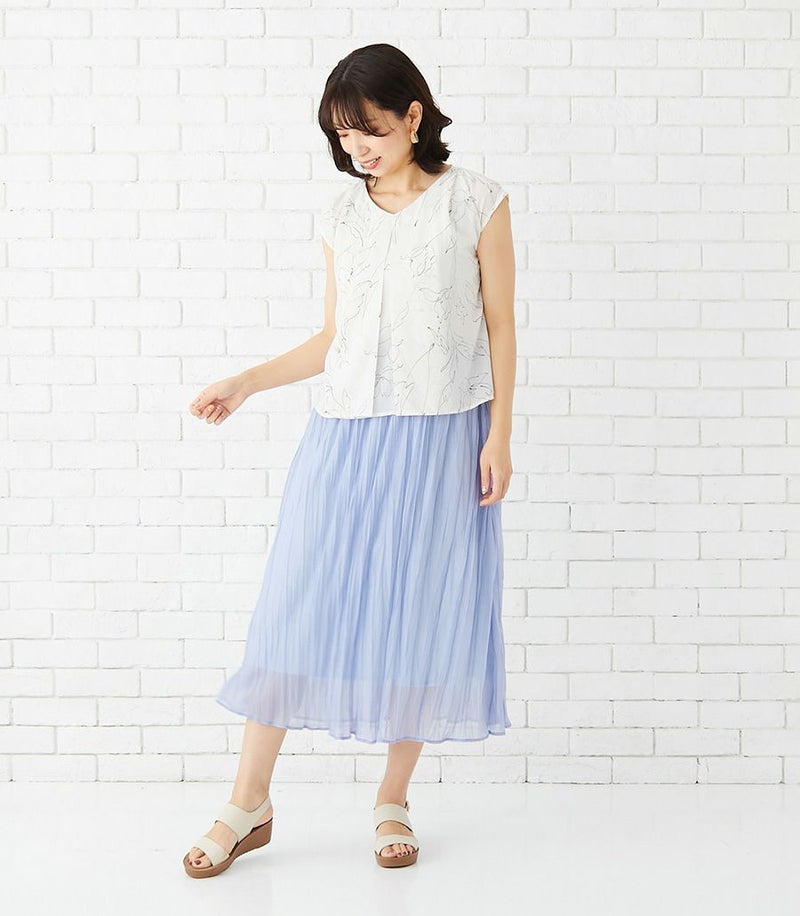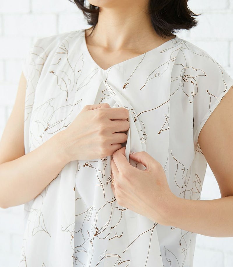 インナー付きスカートと、センターオープンタイプのコンパクトトップスのセットアップワンピース。ラインフラワープリントのトップスとスカート部分の透け感が大人っぽくきれいめな印象に。華やかで春夏のお出かけに活躍する1着です。 ●ポケット× 〈マタニティ(腹囲100cm)対応授乳服〉 まるいお腹を優しく包み込み、妊婦さんがきれいに見えるシルエットにこだわりました。 大きくなったお腹を締めつけず、ゆったりと楽に着ていただけます。 産後の授乳のしやすさも追求した授乳服なので、1枚で2役の便利な授乳服です。 〈生産国:日本〉 〈素材:ポリエステル100% (別布:綿100%/裏地:ポリエステル100%)〉 軽くて速乾性のあるポリエステル素材。スカート部分はランダムなシワ感のある生地を使用。光沢感と透け感が特徴です。 〈洗濯表記:洗濯機OK ※ひっかけにご注意ください〉