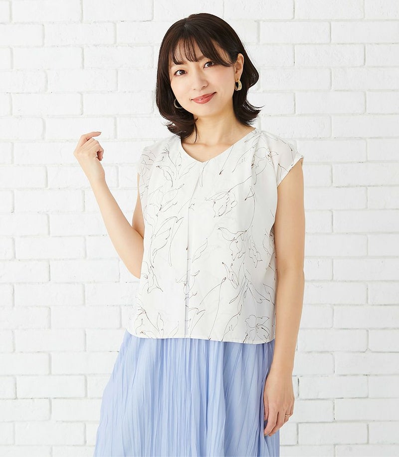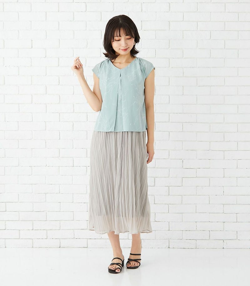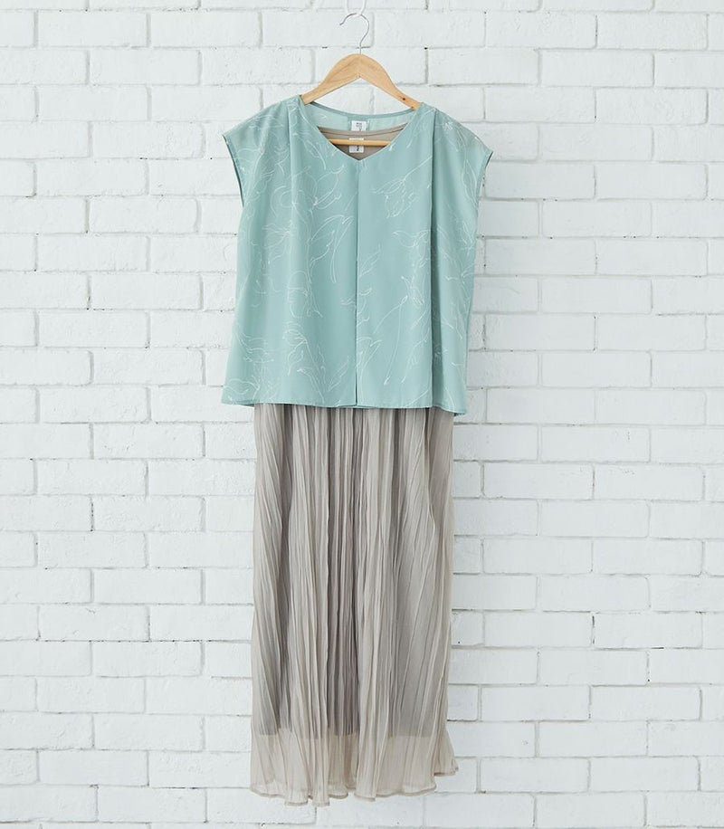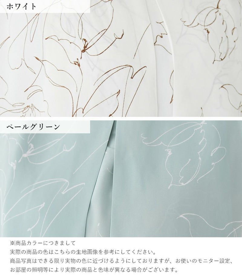 インナー付きスカートと、センターオープンタイプのコンパクトトップスのセットアップワンピース。ラインフラワープリントのトップスとスカート部分の透け感が大人っぽくきれいめな印象に。華やかで春夏のお出かけに活躍する1着です。 COLOR:ペールグリーン/MODEL:164cm