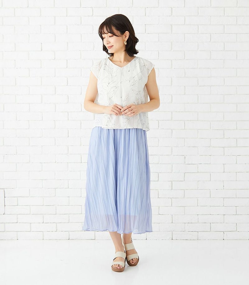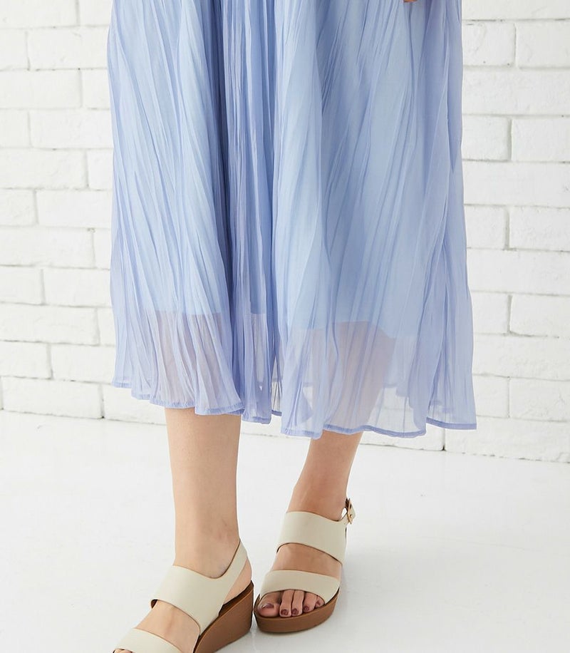 軽くて速乾性のあるポリエステル素材。スカート部分はランダムなシワ感のある生地を使用。光沢感と透け感が特徴です。