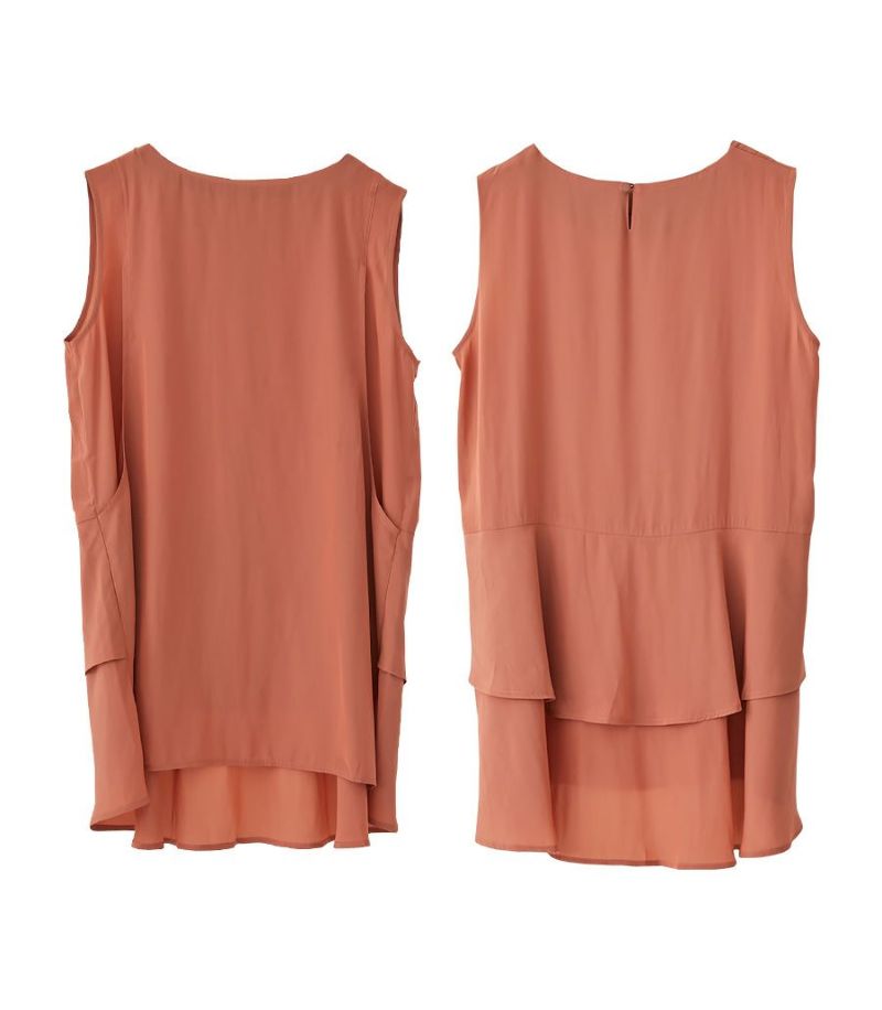 落ち感のあるデシン素材を使用したノースリーブブラウス。バックのフレアーが気になるお尻まわりをさりげなくカバーしてくれます。動くたびに揺れるブラウスで女性らしい印象です。 COLOR:チャコール/MODEL:164cm