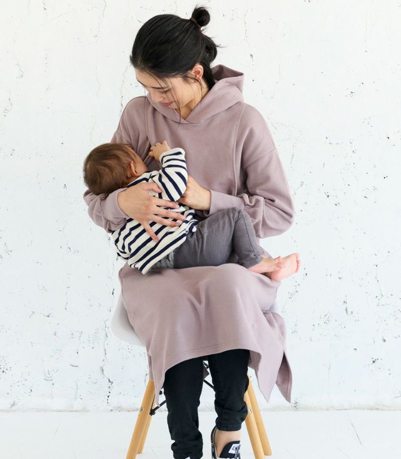 人気のパーカーワンピースに新色が登場!やわらかな裏毛素材を使用した、シンプルなパーカーワンピースは1枚着るだけであたたかく寒い季節も快適にすごせる授乳服です。人気のオーバーシルエットでたっぷりゆったり着られ、マタニティさんもストレスフリーで過ごせます。デイリーだけでなく、部屋着やルームウェアとしても◎ ●ポケット×2 〈マタニティ(腹囲100cm)対応授乳服〉 まるいお腹を優しく包み込み、妊婦さんがきれいに見えるシルエットにこだわりました。 大きくなったお腹を締めつけず、ゆったりと楽に着ていただけます。 産後の授乳のしやすさも追求した授乳服なので、1枚で2役の便利な授乳服です。 〈生産国:日本〉 〈素材:綿100%、リブ部分:綿95% ポリウレタン5%〉 表は天竺編み、裏糸をパイル状に編み込んでいる裏毛はパイルが隙間を作り空気を含むので適度な保温性と吸湿性にすぐれています。やわらか素材で着心地も抜群。 〈洗濯表記:洗濯機OK〉