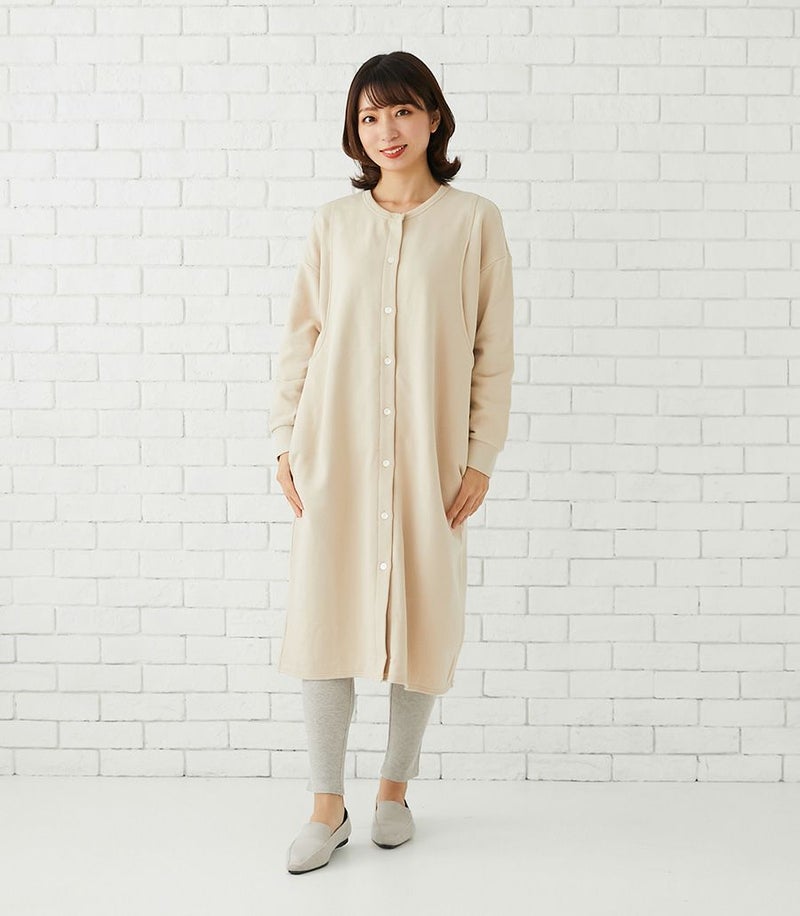 やわらかくあたたかいコットン裏毛素材のパジャマワンピースは臨月までゆったり着られます。入院にも対応できる前開きはタイプは産前産後に大活躍。ワンピースタイプで1枚で着られるのもうれしいですね!寒い季節の夜間授乳も快適に。寒さが気になる方はマタニティレギンス(別売り)を合わせてあたたかく。