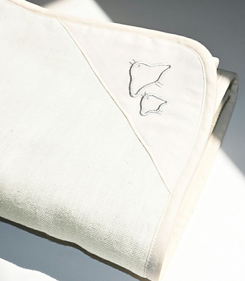 やわらかなオーガニックコットン100%アフガン。おくるみ、ブランケット、ママの膝かけなど幅広く活躍。かわいらしい千鳥の背守り刺繍入りでギフトにもおすすめです。 『背守り』とは…赤ちゃんの健やかな成長を願って着物の背中に縁起のよい図柄の刺繍を入れる昔からの風習です。ガーゼ×パイルのオーガニックコットンのやわらかな生地に刺繍された千鳥は、前に向って飛び跳ねて進む“飛躍”の意味があります。良いことがたくさんありますように。幸運に恵まれますように。と思いを込めました。生地、縫製、刺繍すべて安心の日本製アフガンです。