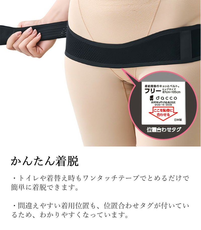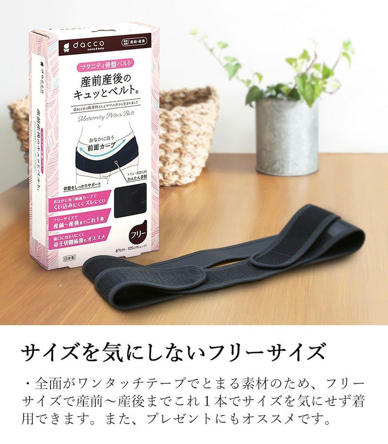●くい込みにくく、ずれにくい快適な着用感で、産前~産後まで長く使える骨盤ベルトです。 ●妊娠中や出産直後の大きなおなかに沿う「前面カーブ」でくい込みにくく、細幅で動きやすくて快適です。 また、滑り止め付きでズレにくくなっています。 ●全面がワンタッチテープでとまる素材のため、フリーサイズで産前~産後までこれ1本でサイズを気にせず着用できます。 ●トイレや着替え時も、ワンタッチテープでとめるだけで簡単に着脱できます。 ●薄手でアウターに響きにくいため、オシャレを楽しめます。またメッシュ素材でムレにくく快適です。 ●おなかに沿う「前面カーブ」とが柔らかく薄い素材が、傷にくい込みにくいため、帝王切開術後でも着用しやすくなっています。 ※この商品は返品交換は承っておりませんので、ご注意ください。 〈ブランド名:dacco(ダッコ)〉 〈ブラック 1枚入り〉 〈フリーサイズ:ヒップ 87cm~105cm〉 〈生産国:日本〉 〈素材:ナイロン ポリウレタン ポリエステル アセテート〉 ※天然ゴム不使用(天然ゴムラテックス由来のたんぱく質を含みません。) 〈配送方法:宅急便〉