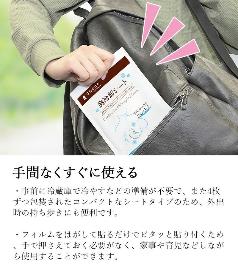 ●胸に沿う形状とストレッチ素材のため、ズレにくくはがれにくい、胸にぴったりフィットする胸用冷却材です。 ●皮膚温-2℃でおだやかに冷やすため、冷やしすぎず授乳中でも安心して使用できます。 ●約4時間冷却が持続するため、次の授乳まで冷やし続けることが可能です。 ●無香料・無着色・弱酸性で、デリケートなママの肌にも安心です。 ●剥離フィルムをはがして貼るだけで簡単に使用できるため、事前準備が不要です。 ※この商品は返品交換は承っておりませんので、ご注意ください。 〈ブランド名:dacco(ダッコ)〉 〈内容量:16枚入(4枚入×4袋)〉 〈シートサイズ:8.5cm×14cm〉 〈生産国:日本〉 〈配送方法:宅急便〉