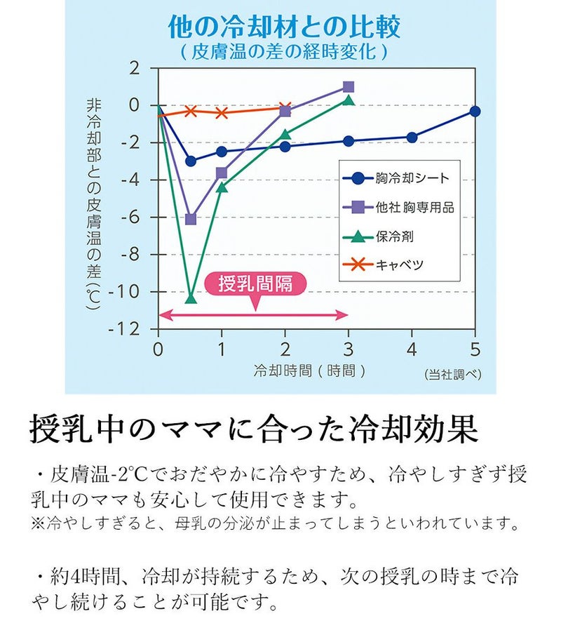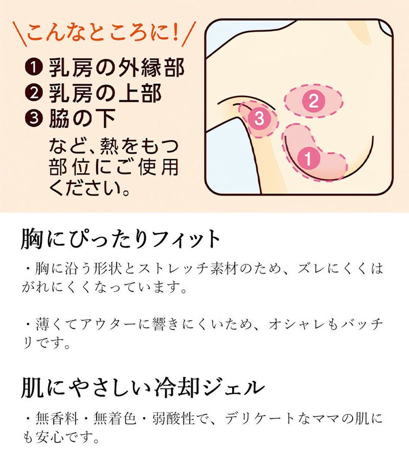 ●胸に沿う形状とストレッチ素材のため、ズレにくくはがれにくい、胸にぴったりフィットする胸用冷却材です。 ●皮膚温-2℃でおだやかに冷やすため、冷やしすぎず授乳中でも安心して使用できます。 ●約4時間冷却が持続するため、次の授乳まで冷やし続けることが可能です。 ●無香料・無着色・弱酸性で、デリケートなママの肌にも安心です。 ●剥離フィルムをはがして貼るだけで簡単に使用できるため、事前準備が不要です。 ※この商品は返品交換は承っておりませんので、ご注意ください。