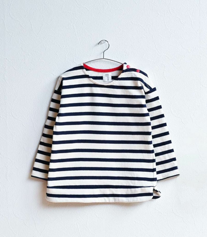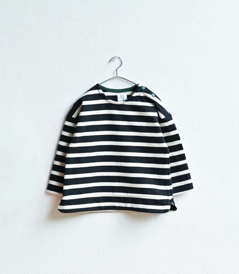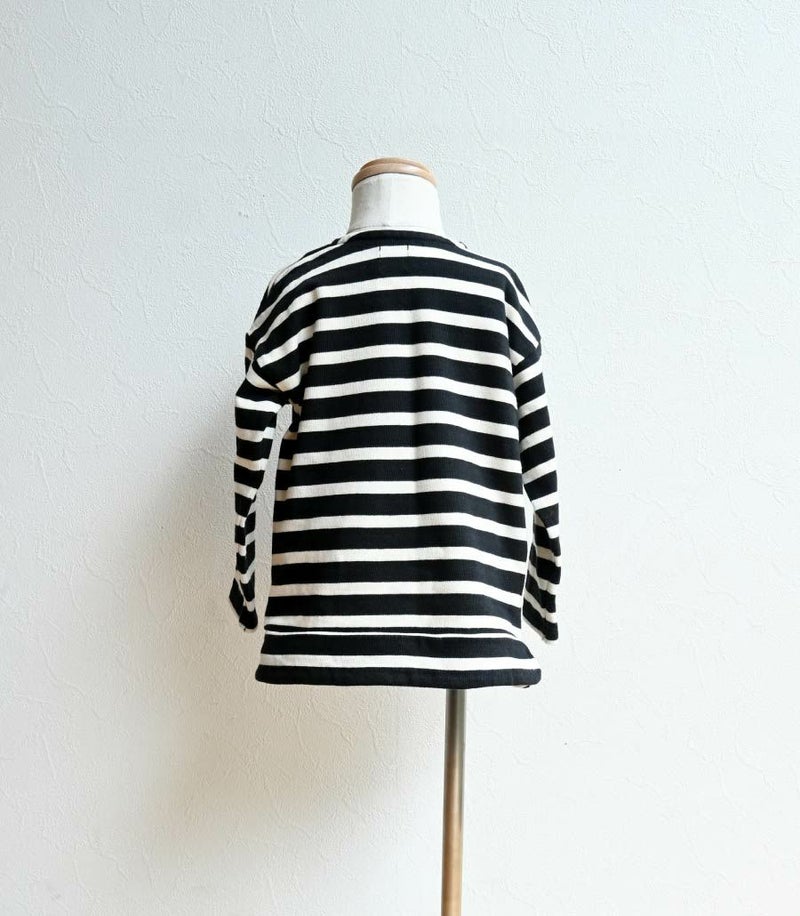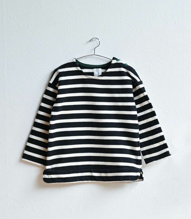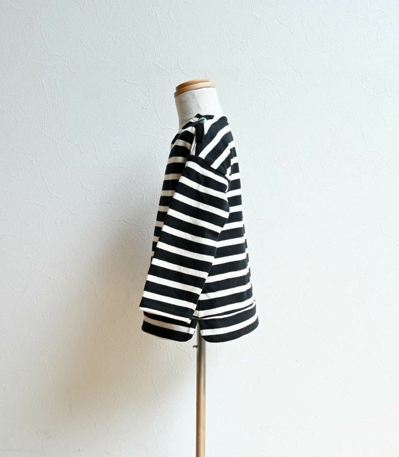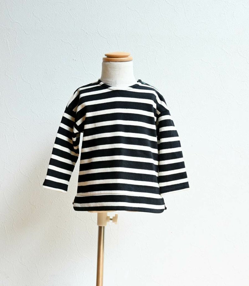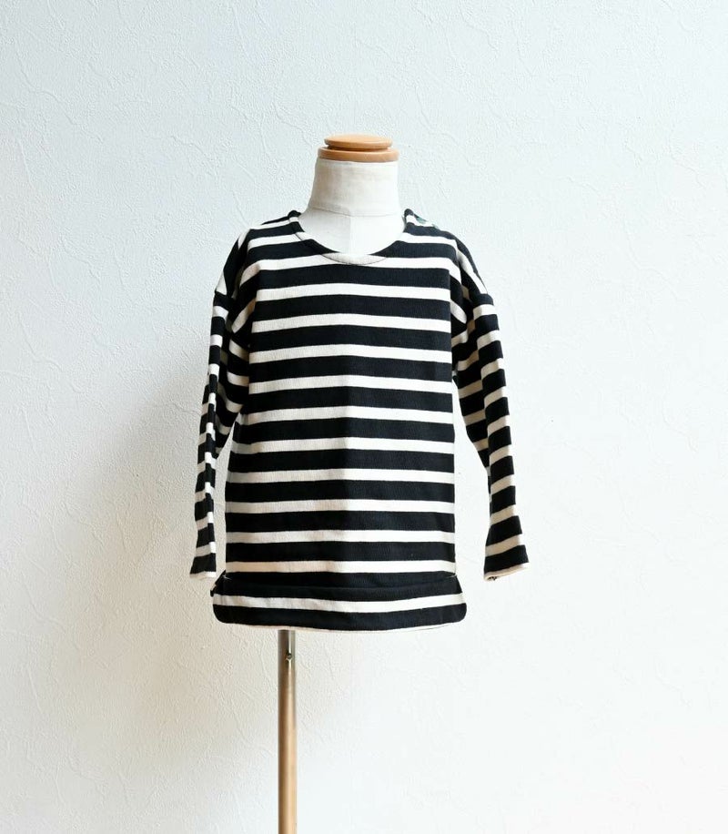 大人サイズをこどもサイズに縮小し、ママとのリンクコーデを楽しめるミニアイテム。 流行りに左右されないボーダーに、首元のカラーテープとダブルになった丸みのある裾もママとのお揃い感を高めます。 よく動くお子様にぴったりのしっかりとしたコットン素材でデイリーにぴったりです〈生産国:日本〉