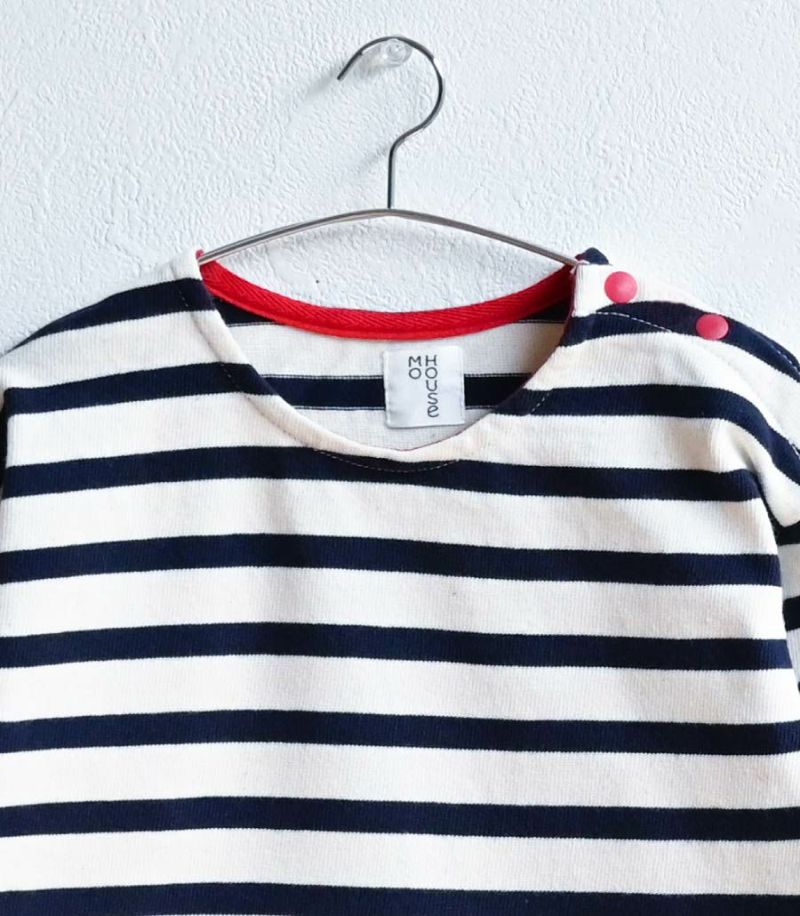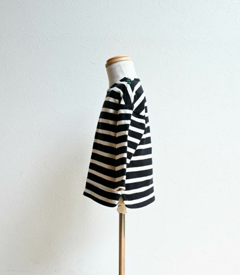 大人サイズをこどもサイズに縮小し、ママとのリンクコーデを楽しめるミニアイテム。 流行りに左右されないボーダーに、首元のカラーテープとダブルになった丸みのある裾もママとのお揃い感を高めます。 よく動くお子様にぴったりのしっかりとしたコットン素材でデイリーにぴったりです〈生産国:日本〉
