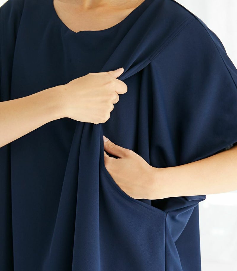 まるいお腹を優しく包み込み、妊婦さんがきれいに見えるシルエットにこだわりました。 大きくなったお腹を締めつけず、ゆったりと楽に着ていただけます。 産後の授乳のしやすさも追求した授乳服なので、1枚で2役の便利な授乳服です。