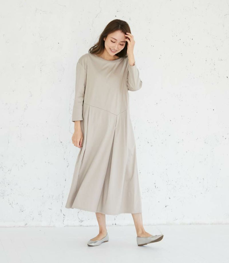 ウエストの切り替えデザインが特徴のワンピースはやわらかなフレアーシルエット。肌ざわりのよいカットソー素材で着心地も◎。シンプルながら存在感のあるデザインで、1枚で着るだけでもコーディネイトが決まります。気になるウエスト周りを切り替えのタックとフレアーラインがスッキリと見せてくれます