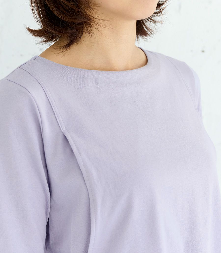 授乳中、ママの洋服に赤ちゃんの顔があたるため、安心・安全に配慮して、授乳するスリット部分は、ノンホック・ノンボタン・ノンチャックに徹底しています。授乳する胸のスリット部分を1cm単位で調整し、外から一番見えずらく授乳しやすい授乳服を制作しています。お腹や胸を出さなくても授乳しやすいので、周りに気づかれずに授乳ができます。また、忙しいママのために動きやすさにもこだわっています。