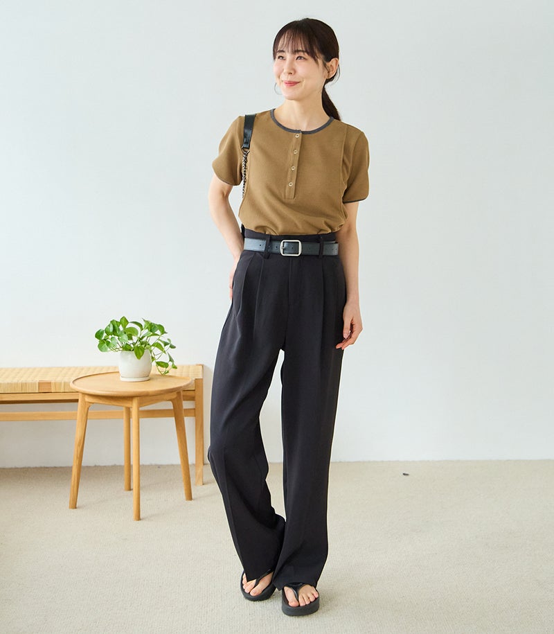 まるでコットンのような自然な風合いとシワになりにくい扱いやすさが魅力のトップスです。毛羽や毛玉ができにくく、長くきれいに着られるのも嬉しいポイント。伸縮性があるので動きやすく、UVカット機能付きで外出も安心です。リングボタンを4つ配したデザインで、さりげなくオシャレさをプラス。すっきり見えつつ程よいゆとりのある身幅で、毎日のコーディネートにも自然に馴染みます。 ●ポケット× 〈生産国:日本〉 〈素材:ポリエステル100%、別布:コットン100%〉 コットンのようなナチュラルな風合いとシワになりにくさを併せ持つ生地。肌に触れる面積が少ないワッフル状で、さらっと快適な着心地。毛羽や毛玉ができにくく、吸水・速乾性も抜群。伸縮性があり、UVカット機能を備えた優れた素材です。 〈洗濯表記:洗濯機OK/ネット使用※アイロン時あて布を使用〉