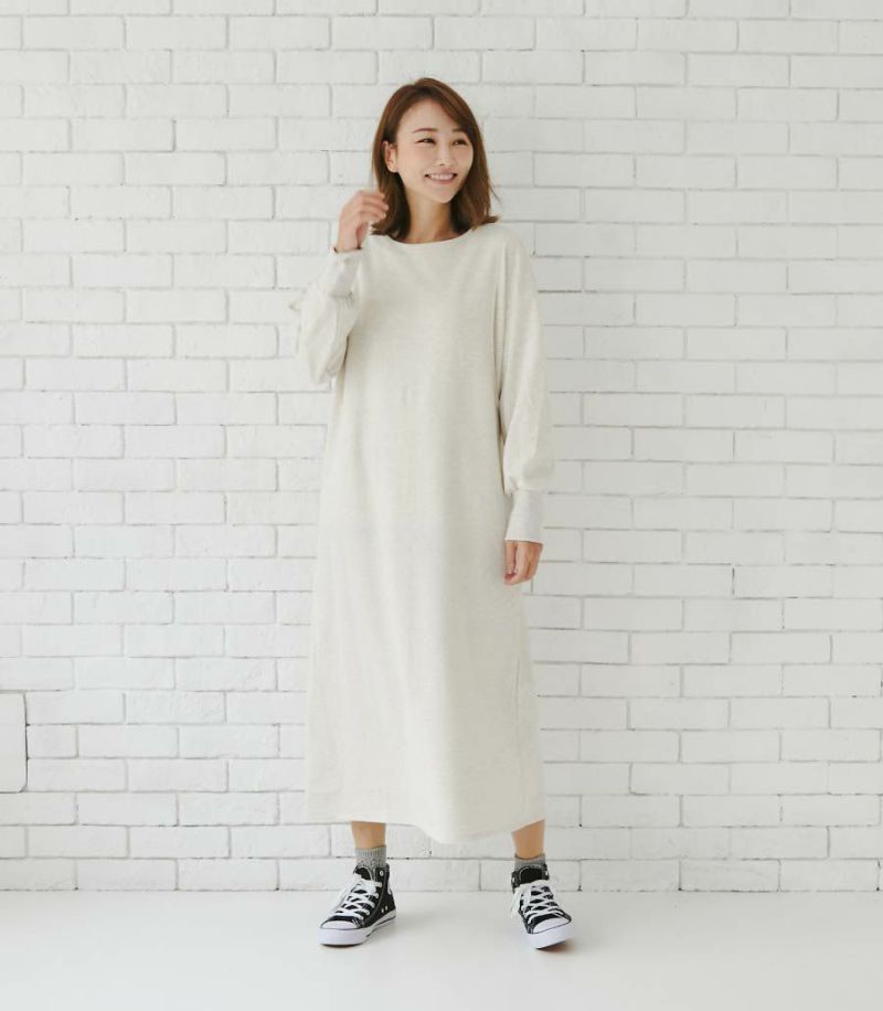 スウェット感覚で着られるきれいなラインのワンピースは着やすくデイリーに着まわせます。 コットン100%のミニ裏毛素材はスウェットでは暑くTシャツではまだ寒い季節の体温調整が難しい時期に大活躍。肌に心地よく、ふっくらとした袖とバックに入った縦ラインでマタニティさんも産後の気になる体型もスッキリ見えます。おうちでもお外でも活躍♪〈生産国:日本〉