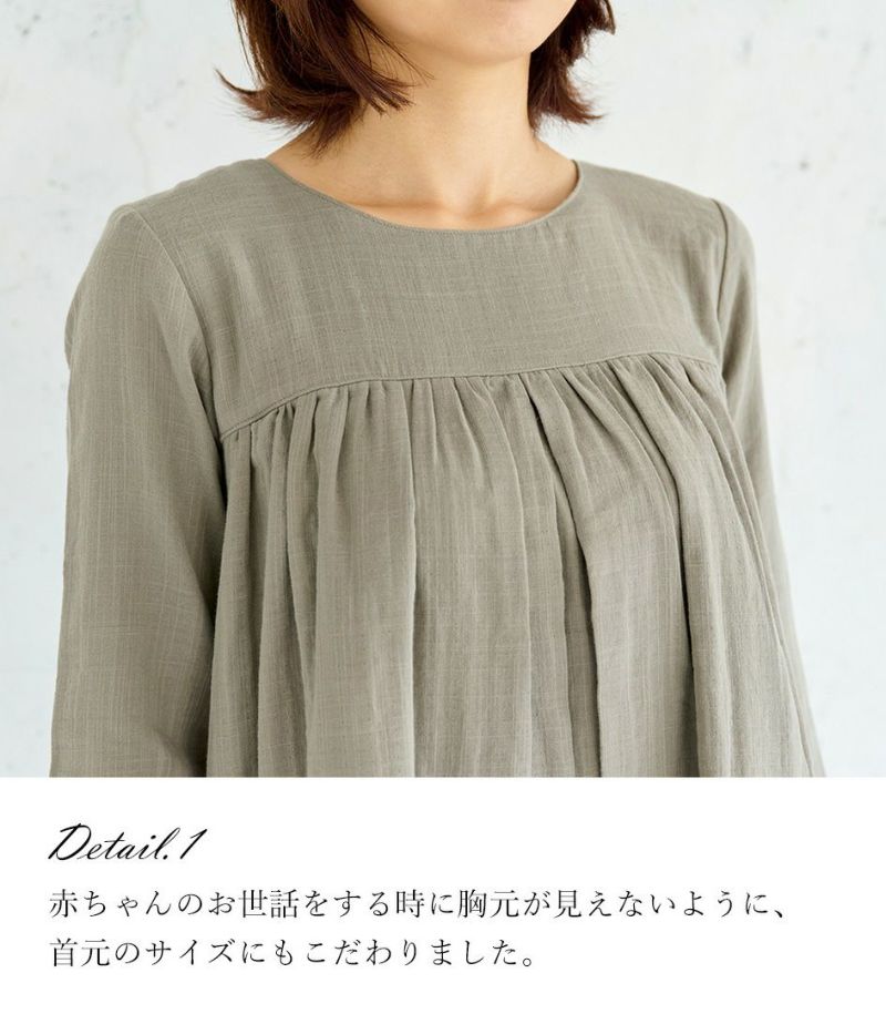やわらかい素材とナチュラルな雰囲気が人気のWガーゼをふんだんに使ったワンピースです。膝がしっかりと隠れる丈が安心です。授乳口がわからないデザインなので、マタニティ期から卒乳後まで長くご愛用いただけます。 COLOR:ベージュ/MODEL:164cm