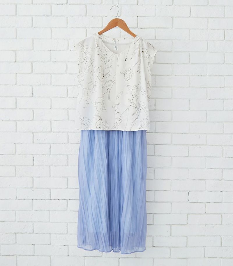 インナー付きスカートと、センターオープンタイプのコンパクトトップスのセットアップワンピース。ラインフラワープリントのトップスとスカート部分の透け感が大人っぽくきれいめな印象に。華やかで春夏のお出かけに活躍する1着です。 ●ポケット× 〈マタニティ(腹囲100cm)対応授乳服〉 まるいお腹を優しく包み込み、妊婦さんがきれいに見えるシルエットにこだわりました。 大きくなったお腹を締めつけず、ゆったりと楽に着ていただけます。 産後の授乳のしやすさも追求した授乳服なので、1枚で2役の便利な授乳服です。 〈生産国:日本〉 〈素材:ポリエステル100% (別布:綿100%/裏地:ポリエステル100%)〉 軽くて速乾性のあるポリエステル素材。スカート部分はランダムなシワ感のある生地を使用。光沢感と透け感が特徴です。 〈洗濯表記:洗濯機OK ※ひっかけにご注意ください〉