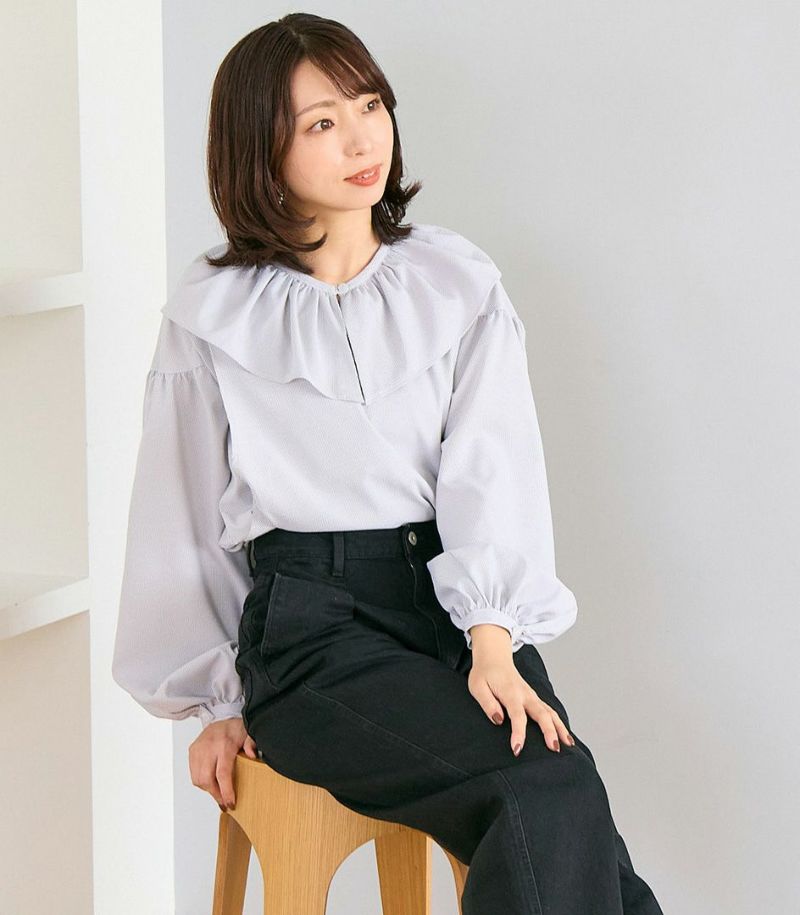 ボリュームのあるフリルの衿がポイントのブラウス。身体のラインを拾わないゆったりとしたシルエットで体型カバーも◎ ふんわりとした袖のデザインで可愛らしい印象です。 COLOR:ネイビー/MODEL:164cm