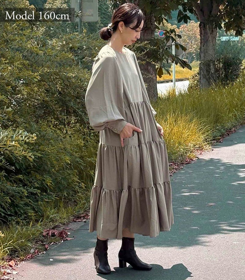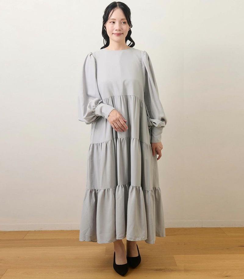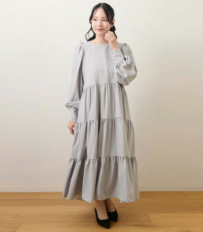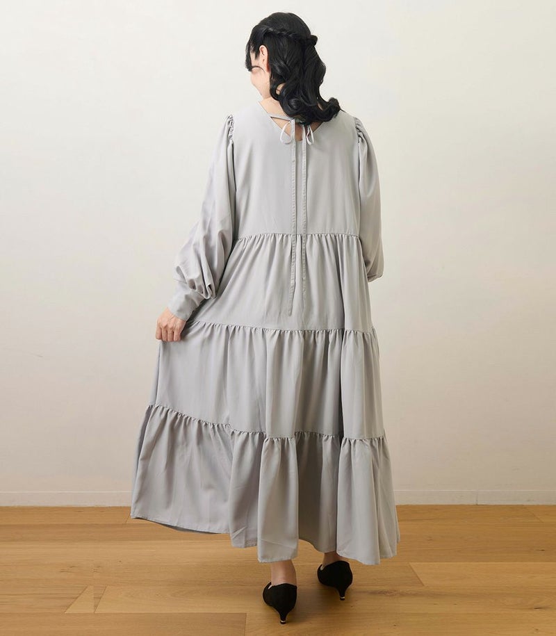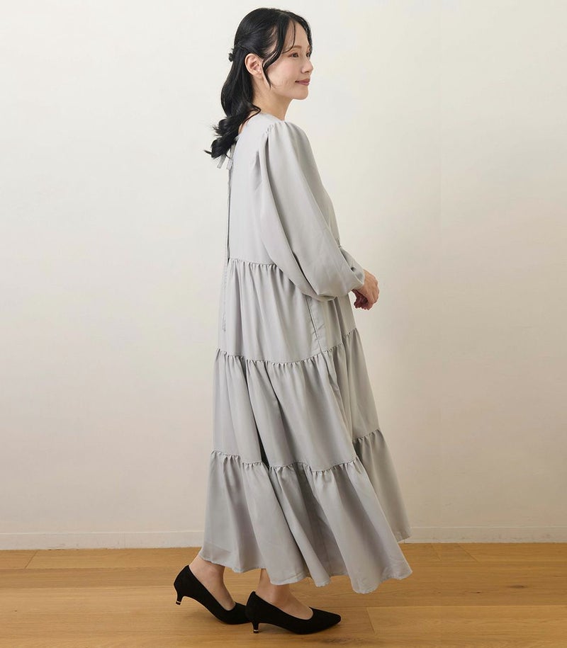 ふんわりと広がるティアードシルエットが女性らしいロングワンピース。ウエストから裾にかけて段々に切り替えたティアードデザインは、動くたびに表情が生まれ、可愛らしさと大人っぽさを兼ね備えています。袖口のボタンや背中のリボンも、さりげない華やかさをプラスしています。 COLOR:グレー/MODEL:158cm