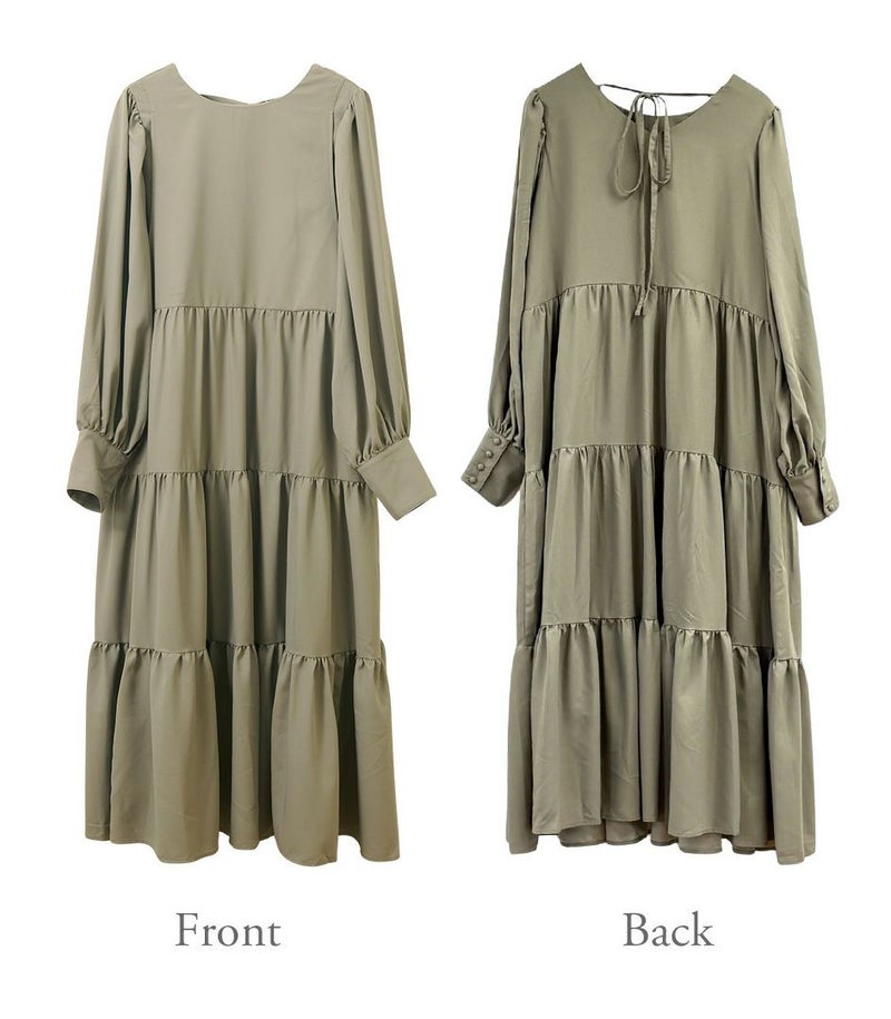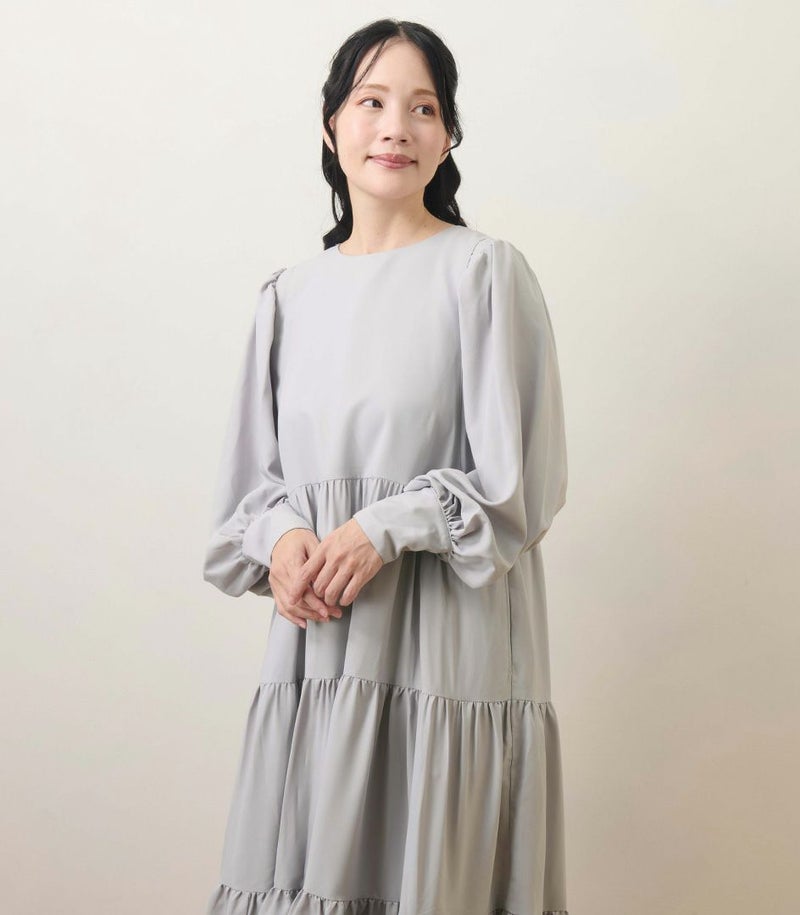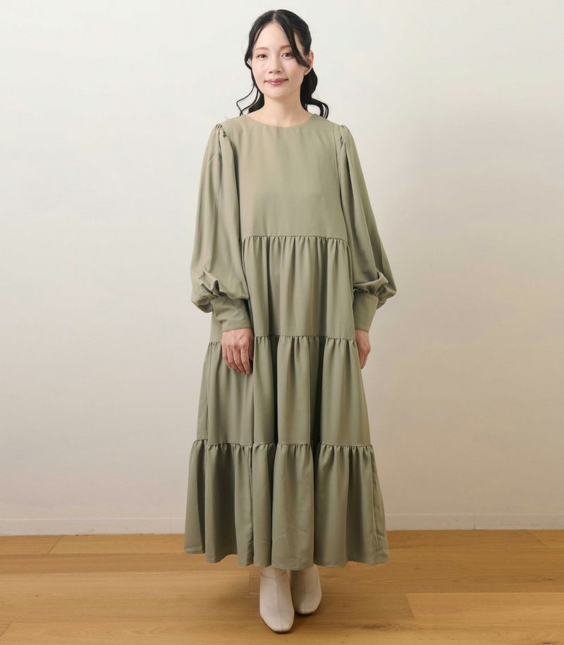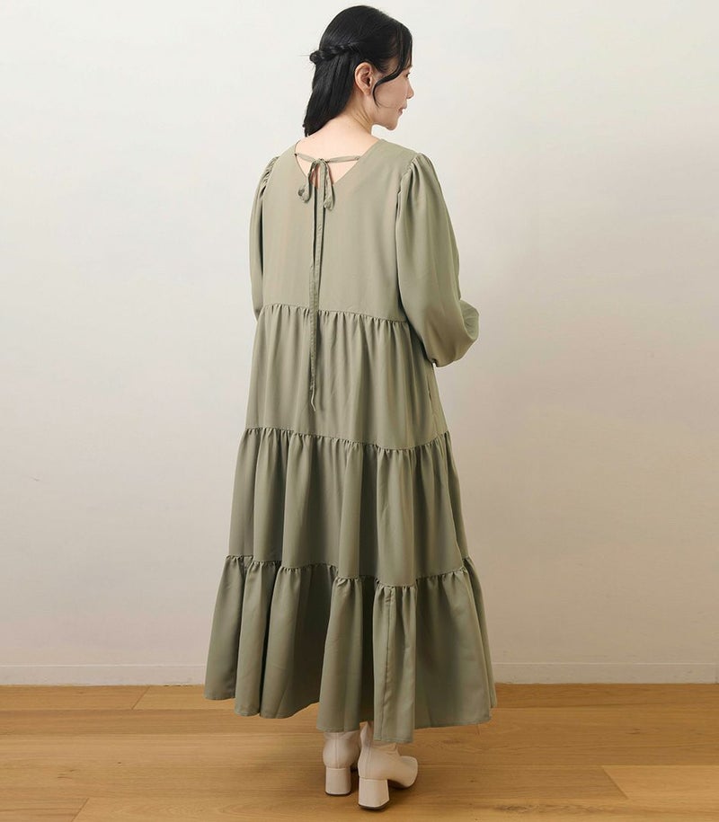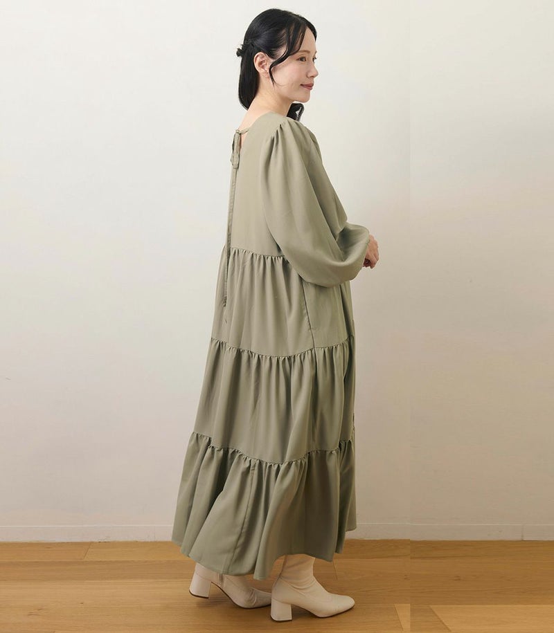ふんわりと広がるティアードシルエットが女性らしいロングワンピース。ウエストから裾にかけて段々に切り替えたティアードデザインは、動くたびに表情が生まれ、可愛らしさと大人っぽさを兼ね備えています。袖口のボタンや背中のリボンも、さりげない華やかさをプラスしています。 COLOR:グレー/MODEL:158cm