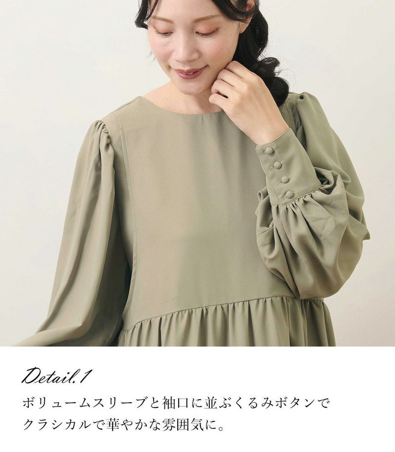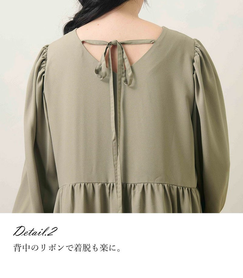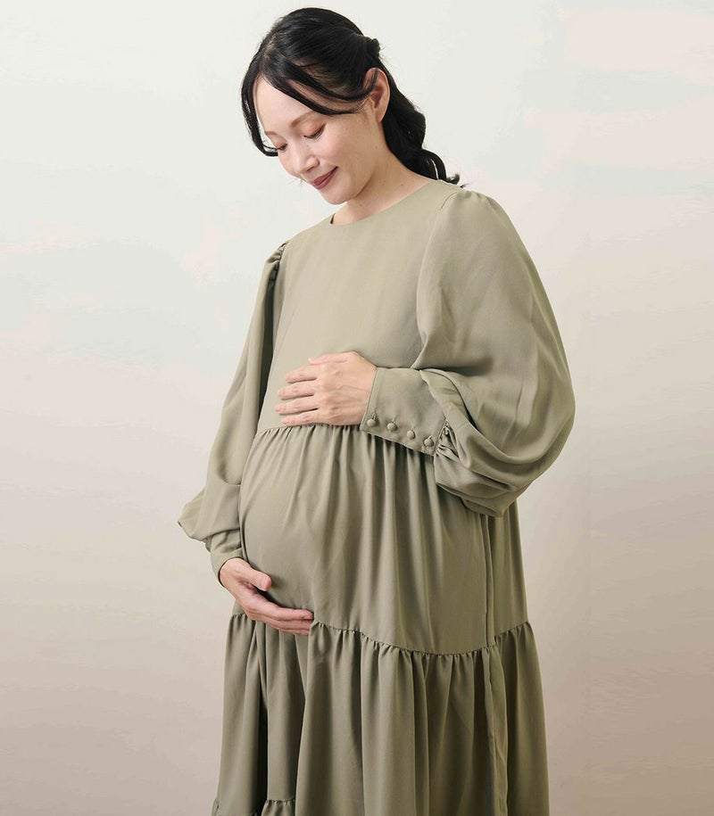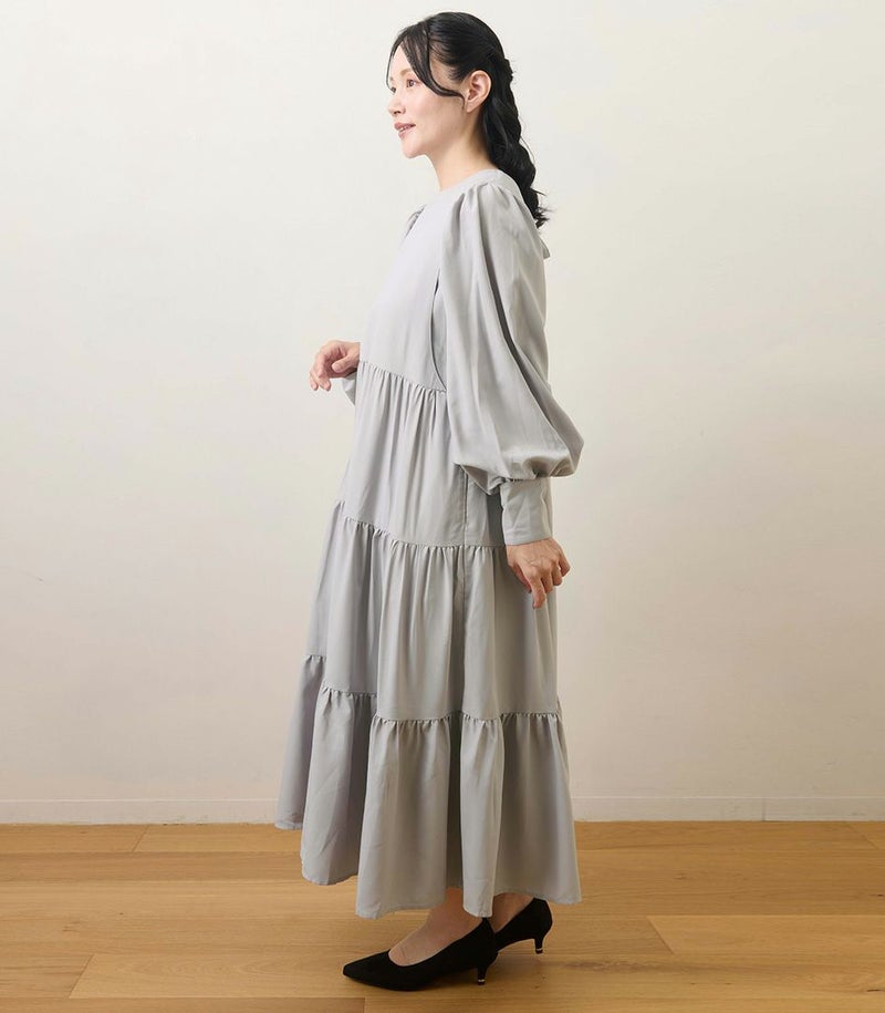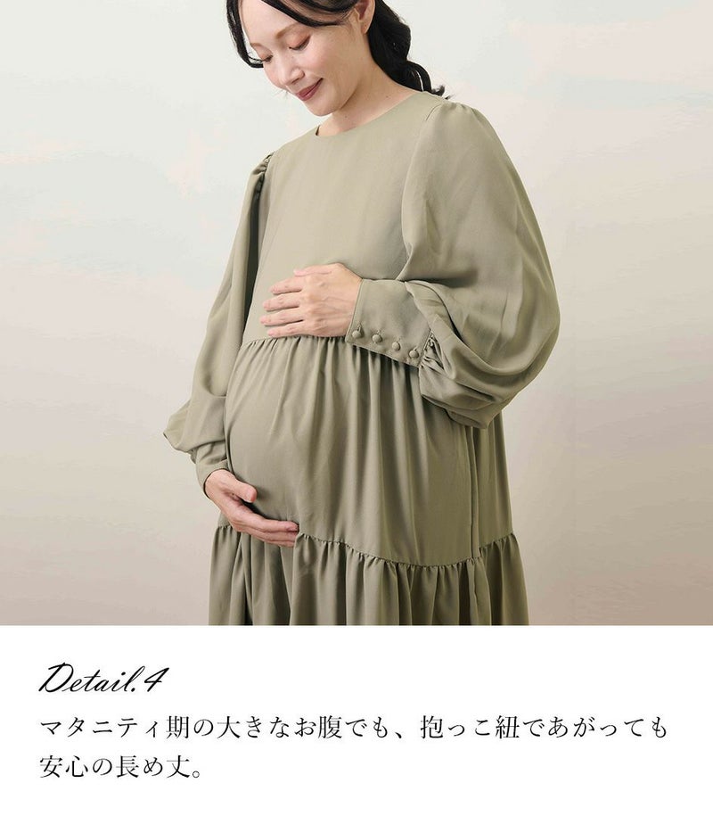 ふんわりと広がるティアードシルエットが女性らしいロングワンピース。ウエストから裾にかけて段々に切り替えたティアードデザインは、動くたびに表情が生まれ、可愛らしさと大人っぽさを兼ね備えています。袖口のボタンや背中のリボンも、さりげない華やかさをプラスしています。 ●ポケット×2 〈マタニティ(腹囲100cm)対応授乳服〉 まるいお腹を優しく包み込み、妊婦さんがきれいに見えるシルエットにこだわりました。 大きくなったお腹を締めつけず、ゆったりと楽に着ていただけます。 産後の授乳のしやすさも追求した授乳服なので、1枚で2役の便利な授乳服です。 〈生産国:日本〉 〈素材:ポリエステル100%〉 ドビー織りでほどよい光沢感ととろみのある落ち感、さらっとした生地感が特徴です。シワになりにくいのもうれしいポイント。 〈洗濯表記:洗濯機OK/ネット使用〉