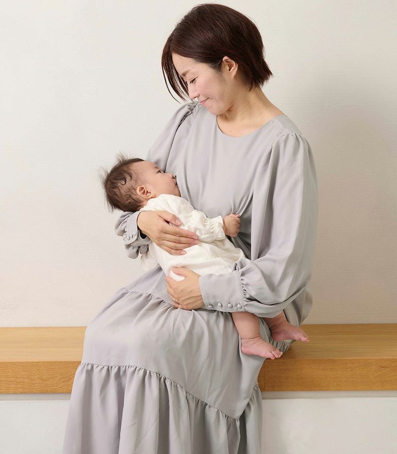 モーハウスの授乳服ならではの、ボタンもファスナーもない授乳口。だからこその「授乳しやすさ」と「安全性」には自信があります。 前身頃が二重構造になっていて、上側の身頃にはサイドのスリット、内側の身頃にはセンターにスリットがあり、授乳中は肌が露出してしまう心配はありませんので安心です。授乳後は布を元に戻すだけで、授乳口が隠れます。