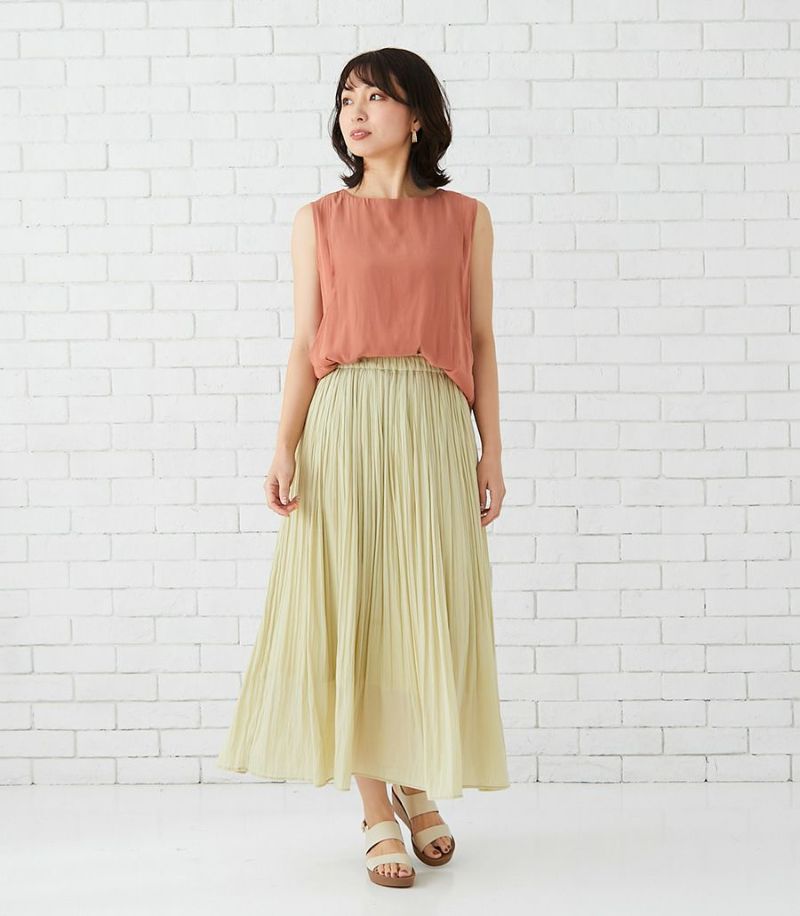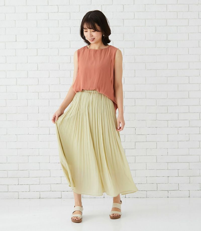 落ち感のあるデシン素材を使用したノースリーブブラウス。バックのフレアーが気になるお尻まわりをさりげなくカバーしてくれます。動くたびに揺れるブラウスで女性らしい印象です。 COLOR:チャコール/MODEL:164cm
