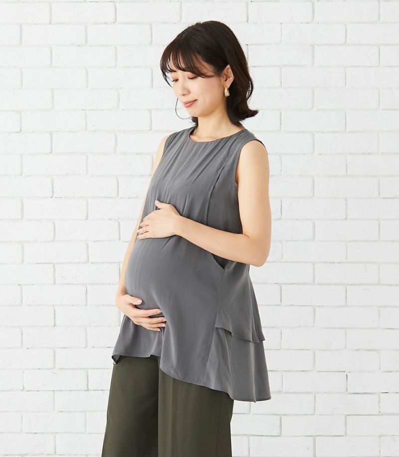 落ち感のあるデシン素材を使用したノースリーブブラウス。バックのフレアーが気になるお尻まわりをさりげなくカバーしてくれます。動くたびに揺れるブラウスで女性らしい印象です。 ●ポケット× 〈マタニティ(腹囲100cm)対応授乳服〉 まるいお腹を優しく包み込み、妊婦さんがきれいに見えるシルエットにこだわりました。 大きくなったお腹を締めつけず、ゆったりと楽に着ていただけます。 産後の授乳のしやすさも追求した授乳服なので、1枚で2役の便利な授乳服です。 〈生産国:日本〉 〈素材:ポリエステル100%〉 落ち感のある柔らかな割織素材。ナチュラルなビンテージ加工で落ち着いた印象に。お洗濯にも強いイージーケア素材です。 〈洗濯表記:洗濯機OK〉