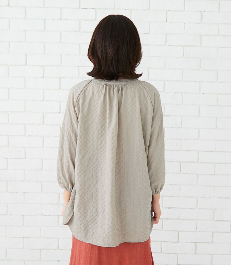 程よい透け感があり、軽やかな印象のブラウス。ボリュームのある袖で、やわらかく、ふんわりとしたシルエットに仕上げました。凹凸感のある生地で汗ばむ季節にも肌に張り付かず、さらりと快適に過ごすことができます。