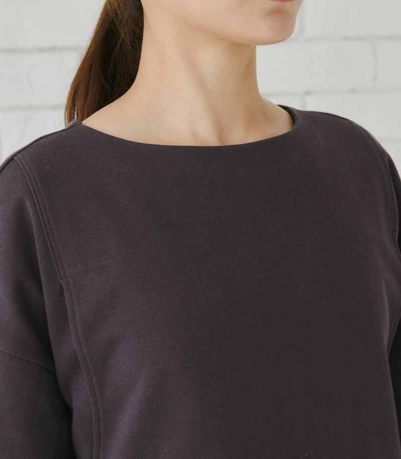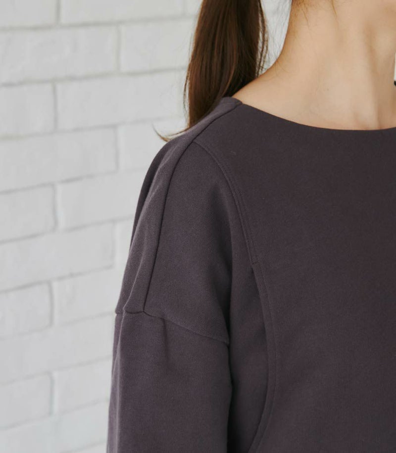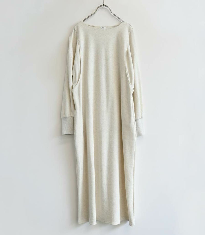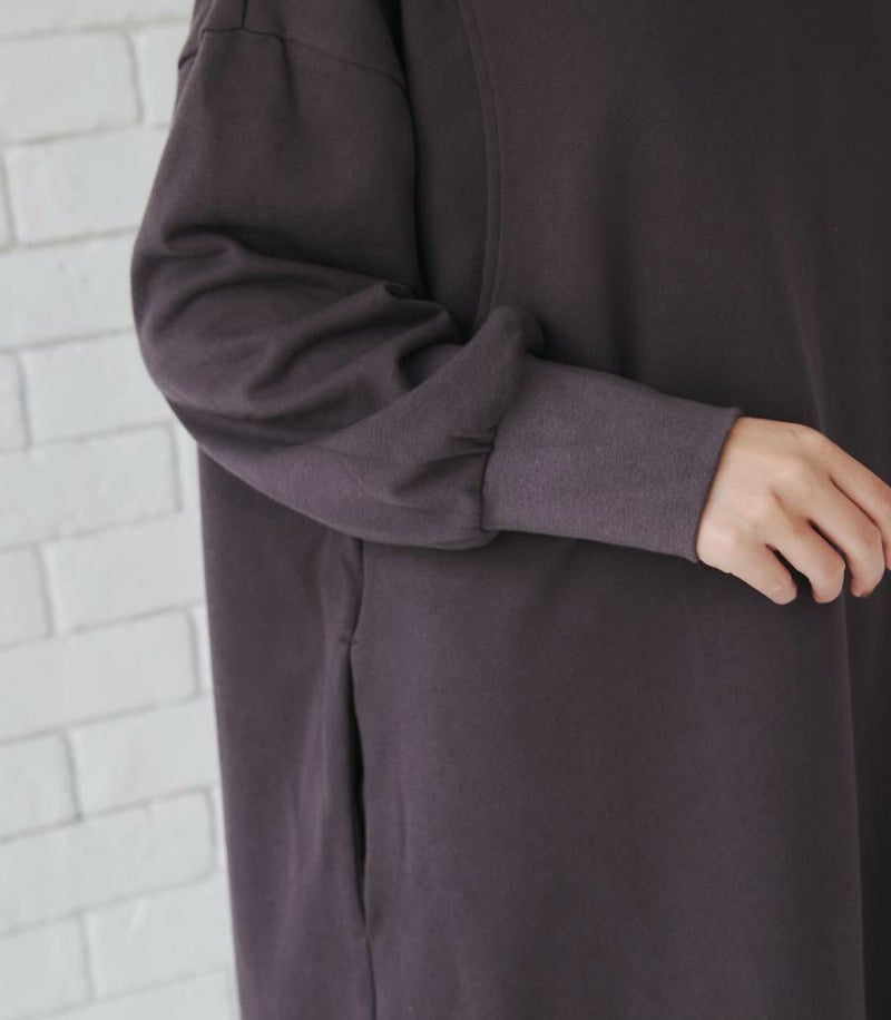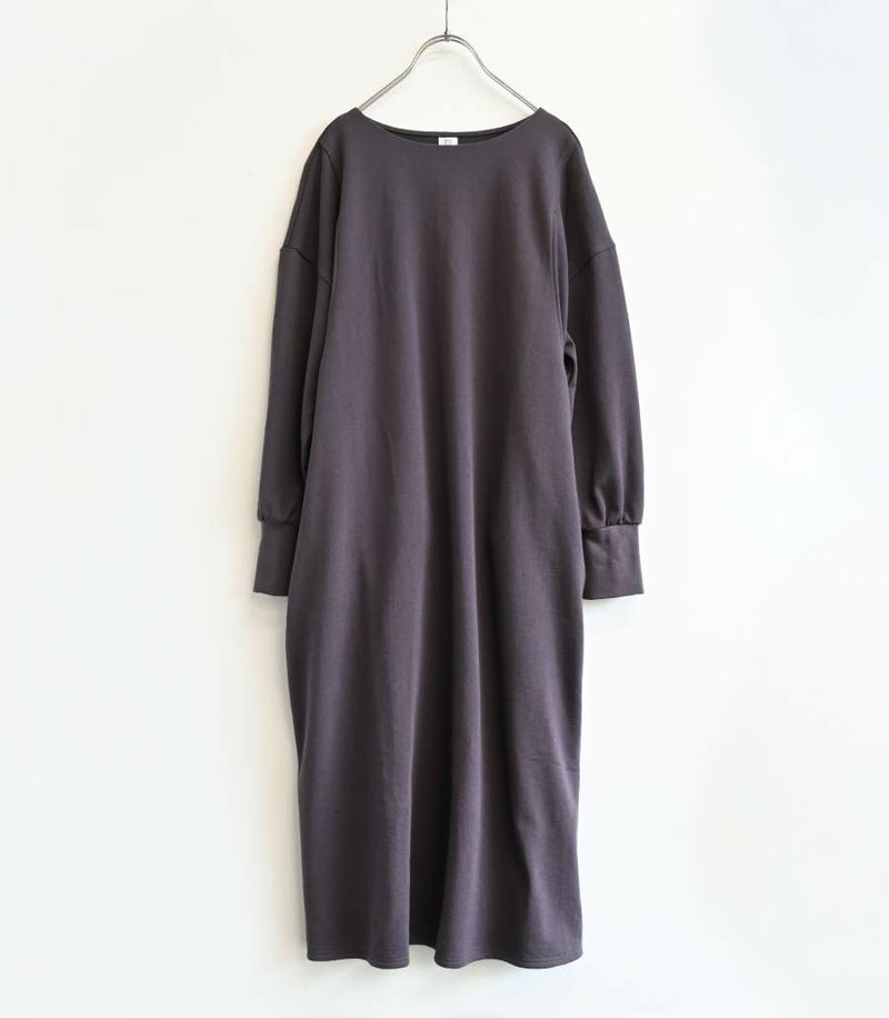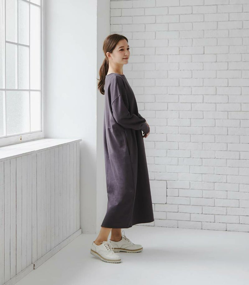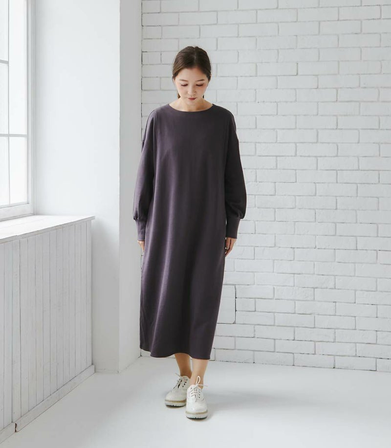 スウェット感覚で着られるきれいなラインのワンピースは着やすくデイリーに着まわせます。 コットン100%のミニ裏毛素材はスウェットでは暑くTシャツではまだ寒い季節の体温調整が難しい時期に大活躍。肌に心地よく、ふっくらとした袖とバックに入った縦ラインでマタニティさんも産後の気になる体型もスッキリ見えます。おうちでもお外でも活躍♪〈生産国:日本〉