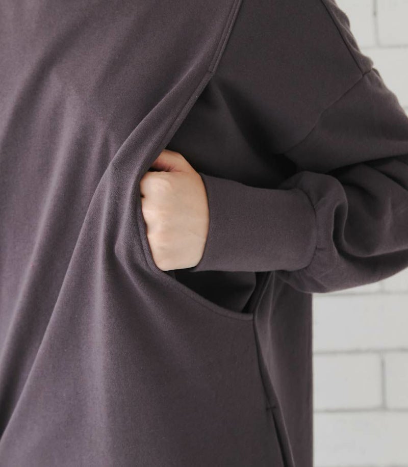 アイボリーを購入し、秋に何着か買った中で一番気に入っています。気軽に着られるスウェット生地ですが、白っぽい色なので少し綺麗めな感じがします。冬はこれだけでは寒いですが、インナーやタイツなどで調整すれば、真冬以外は出番が多そうです。授乳ももちろんしやすいです。