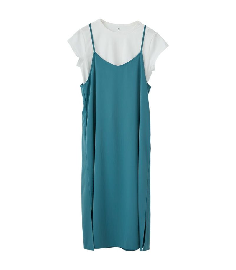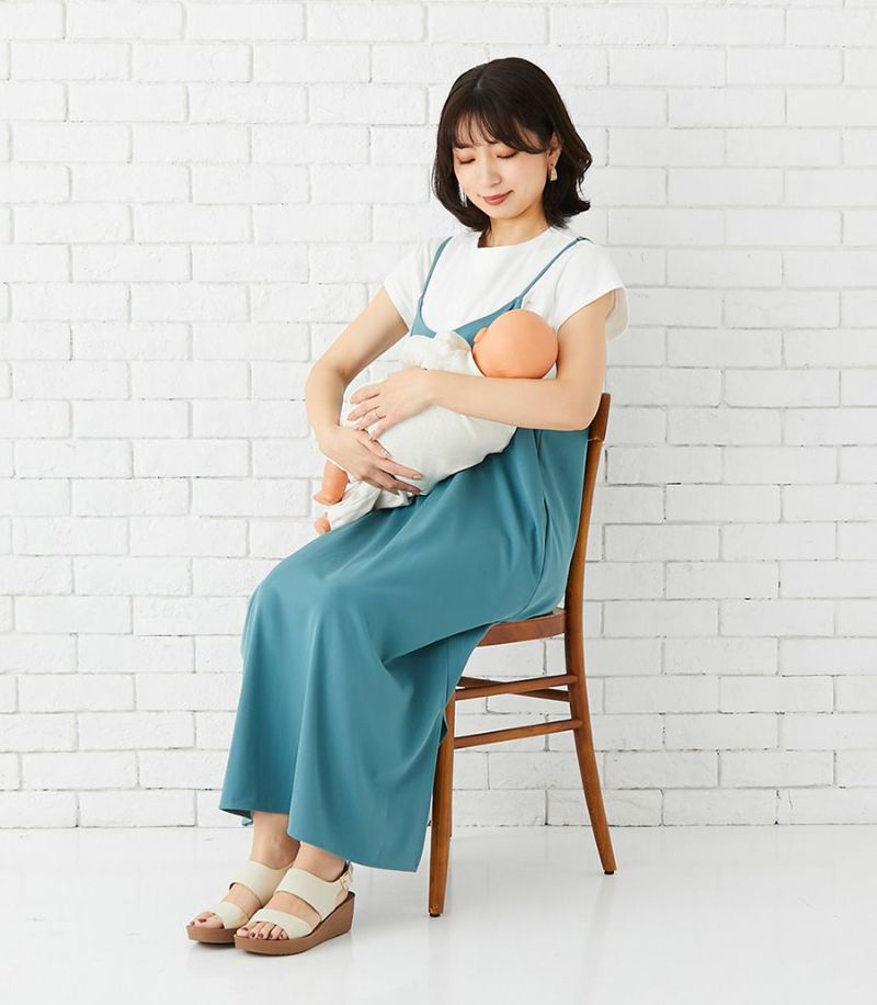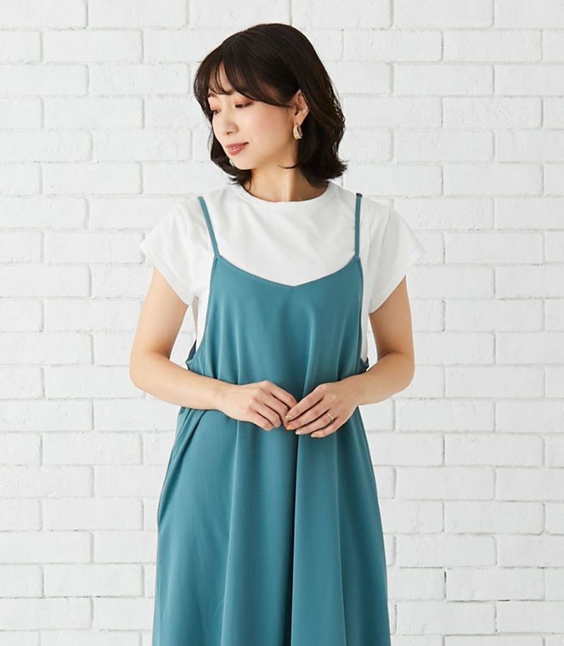 ラインがきれいでしっかりとしたコットン100%のTシャツ+マットでドライタッチな風合いのキャミワンピースのセットは、着心地のよさと、授乳のしやすい工夫がたくさん。シンプルなのでお手持ちのアイテムにも合わせやすく、季節を問わず活躍する便利なセットワンピース。 COLOR:ブルーグリーン/MODEL:164cm