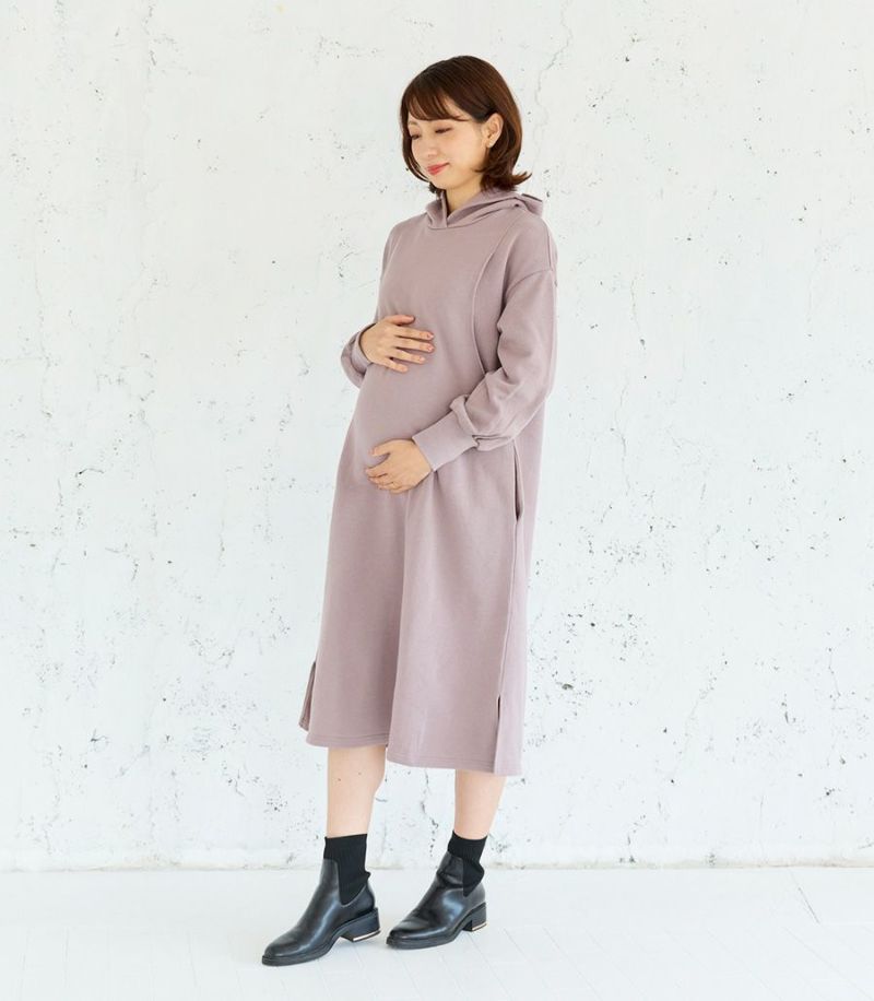 人気のパーカーワンピースに新色が登場!やわらかな裏毛素材を使用した、シンプルなパーカーワンピースは1枚着るだけであたたかく寒い季節も快適にすごせる授乳服です。人気のオーバーシルエットでたっぷりゆったり着られ、マタニティさんもストレスフリーで過ごせます。デイリーだけでなく、部屋着やルームウェアとしても◎ ●ポケット×2 〈マタニティ(腹囲100cm)対応授乳服〉 まるいお腹を優しく包み込み、妊婦さんがきれいに見えるシルエットにこだわりました。 大きくなったお腹を締めつけず、ゆったりと楽に着ていただけます。 産後の授乳のしやすさも追求した授乳服なので、1枚で2役の便利な授乳服です。 〈生産国:日本〉 〈素材:綿100%、リブ部分:綿95% ポリウレタン5%〉 表は天竺編み、裏糸をパイル状に編み込んでいる裏毛はパイルが隙間を作り空気を含むので適度な保温性と吸湿性にすぐれています。やわらか素材で着心地も抜群。 〈洗濯表記:洗濯機OK〉