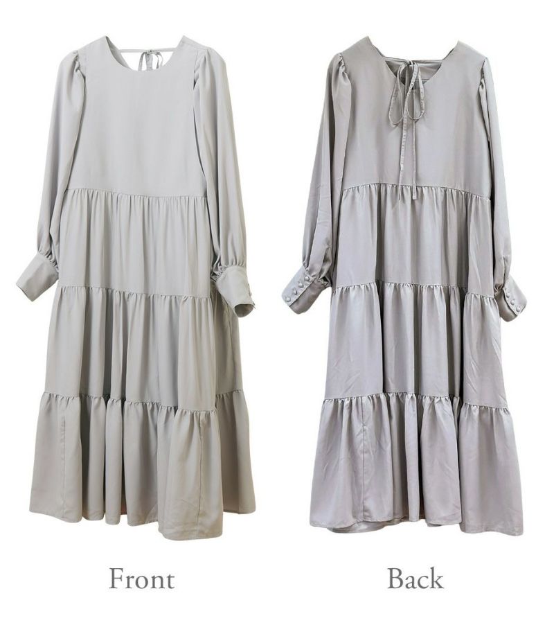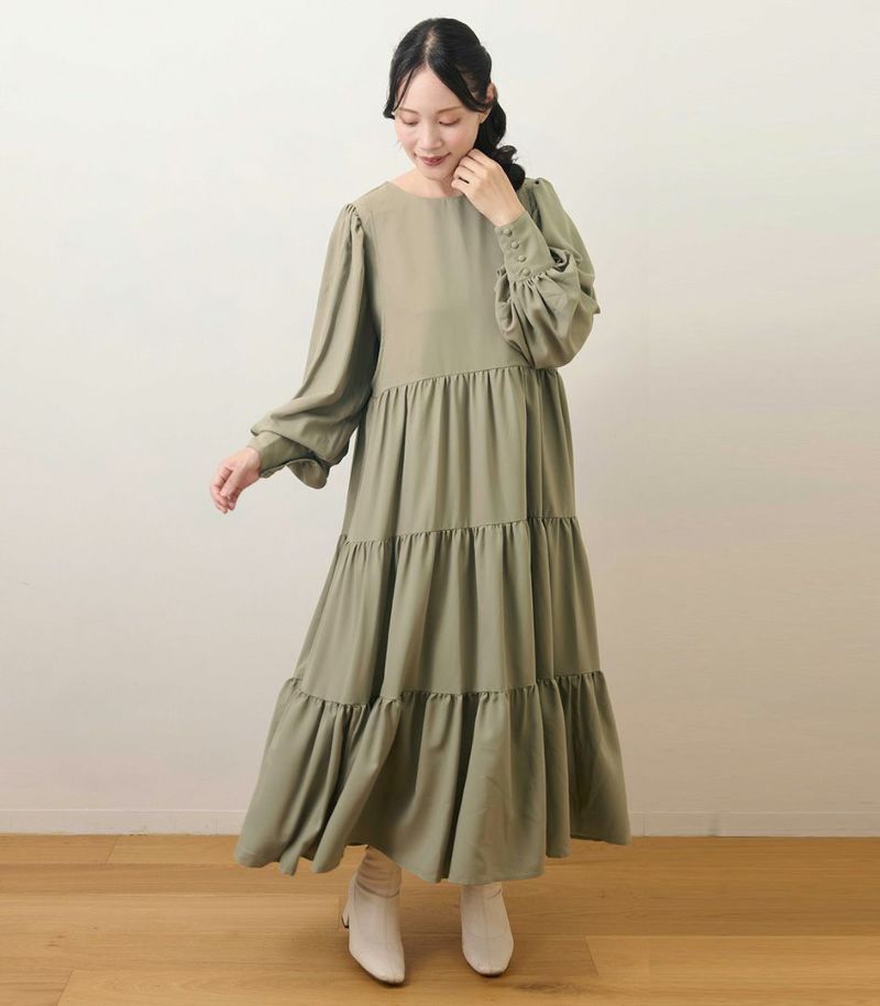 ふんわりと広がるティアードシルエットが女性らしいロングワンピース。ウエストから裾にかけて段々に切り替えたティアードデザインは、動くたびに表情が生まれ、可愛らしさと大人っぽさを兼ね備えています。袖口のボタンや背中のリボンも、さりげない華やかさをプラスしています。 COLOR:グレー/MODEL:158cm