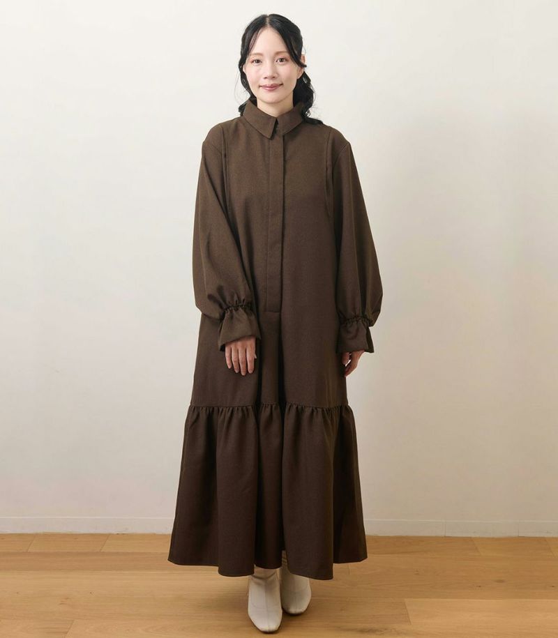 ウールのような柔らかさと高級感のある風合いが特徴のロングワンピース。裾に切り替えを入れたフレアシルエットは歩くたびに揺れて、女性らしい華やかな印象に。フロントは前立てに布を重ねることでボタンが隠れる仕様(比翼仕立て)にし、体型カバーをしながらすっきり見えが叶う1枚です。 COLOR:ライトカーキ/MODEL:158cm