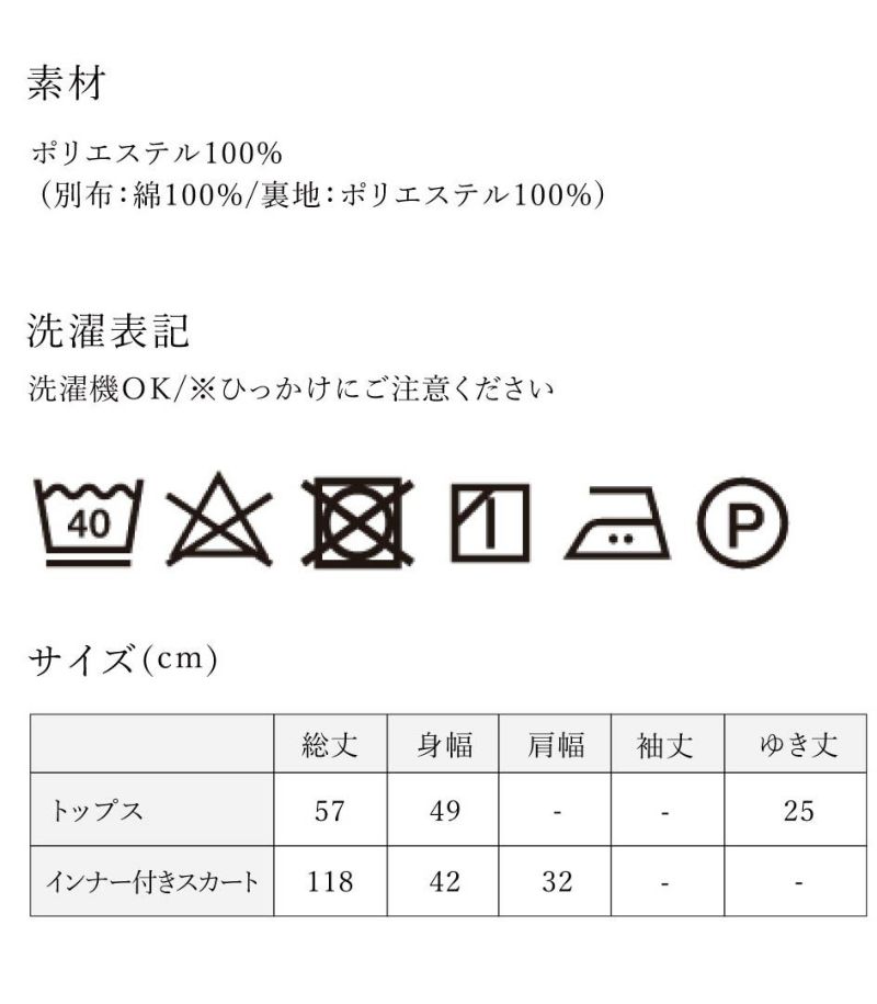 軽くて速乾性のあるポリエステル素材。スカート部分はランダムなシワ感のある生地を使用。光沢感と透け感が特徴です。