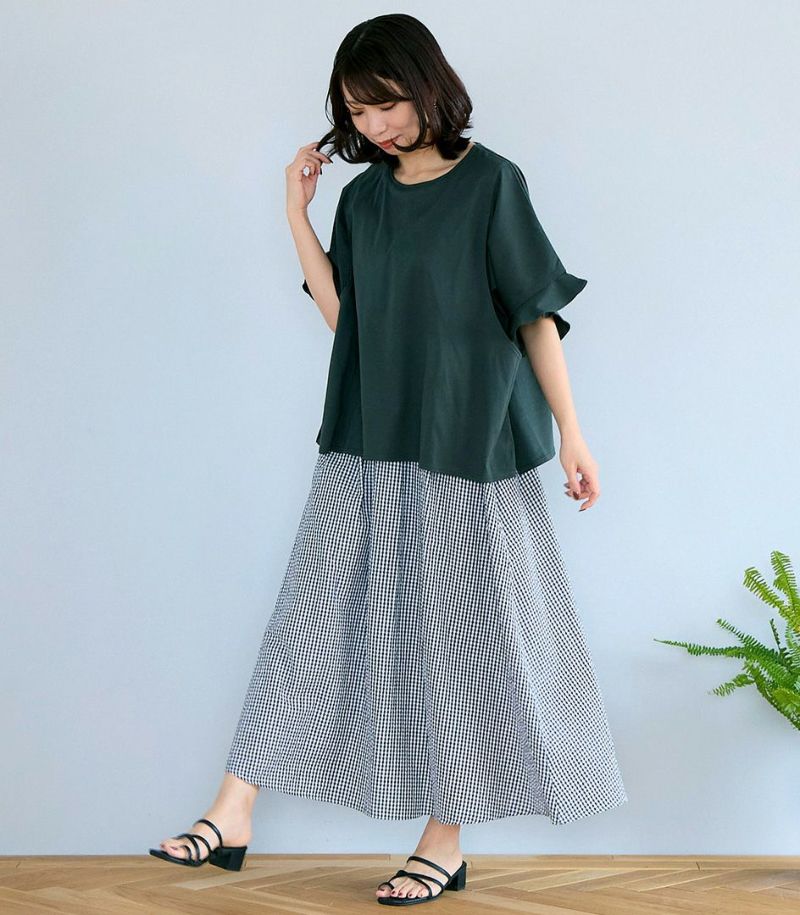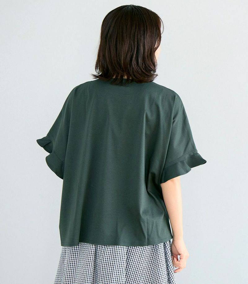 袖のフリルがポイントのオーガニックコットンTシャツ。ゆったりとしたシルエットは身体のラインを拾いにくく体型カバーも◎ オーガニックコットンのやさしい肌触りでママにも赤ちゃんにもやさしい1枚です。 COLOR:グリーン/MODEL:164cm