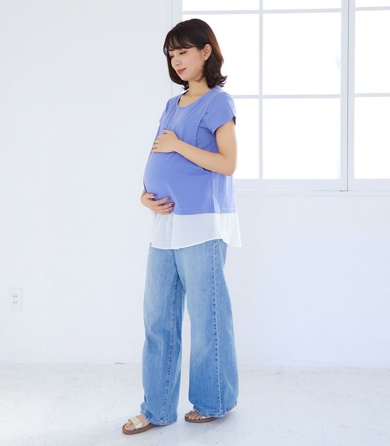 デシン素材で切り替えた裾が、ひらひらと軽やかで、フェミニンなトップス。着丈が長めで、産前産後の気になる腰周りをやさしくカバーします。上身頃は、なめらかで落ち感のあるレーヨン混コットンを使用した肌触りのよい1枚です。