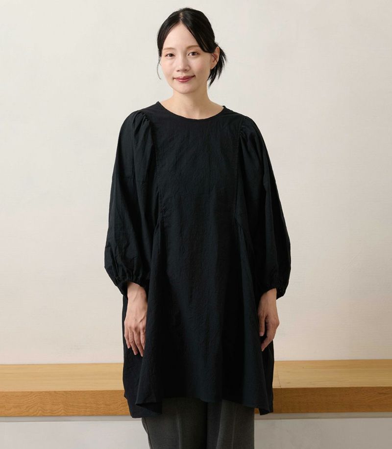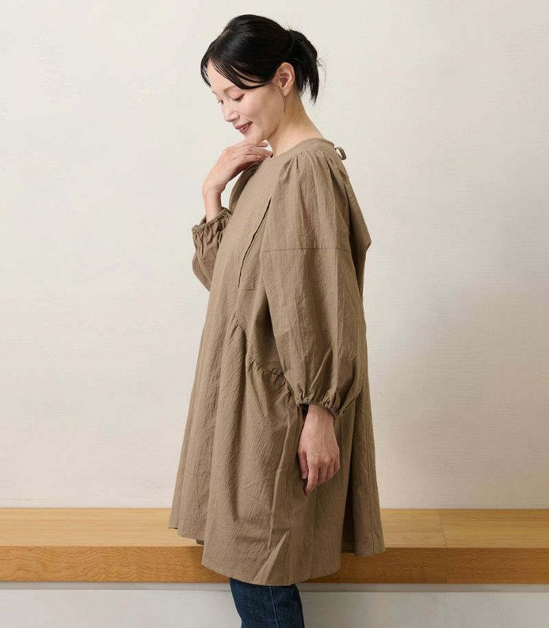 綿100%のコットンローン素材を使用した、ふんわりシルエットのチュニック。くしゅくしゅとした風合いが、ナチュラルでやさしい印象に。 体のラインを拾わないゆったりシルエットと長めの着丈は、体型カバーも◎ COLOR:ライトブラウン/MODEL:158cm