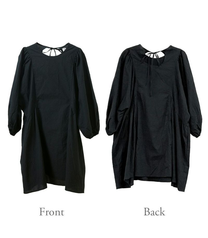 サイドのギャザー切替やボリュームのある袖が特徴。背中のリボンで後ろ姿にもさりげないアクセントをプラス。