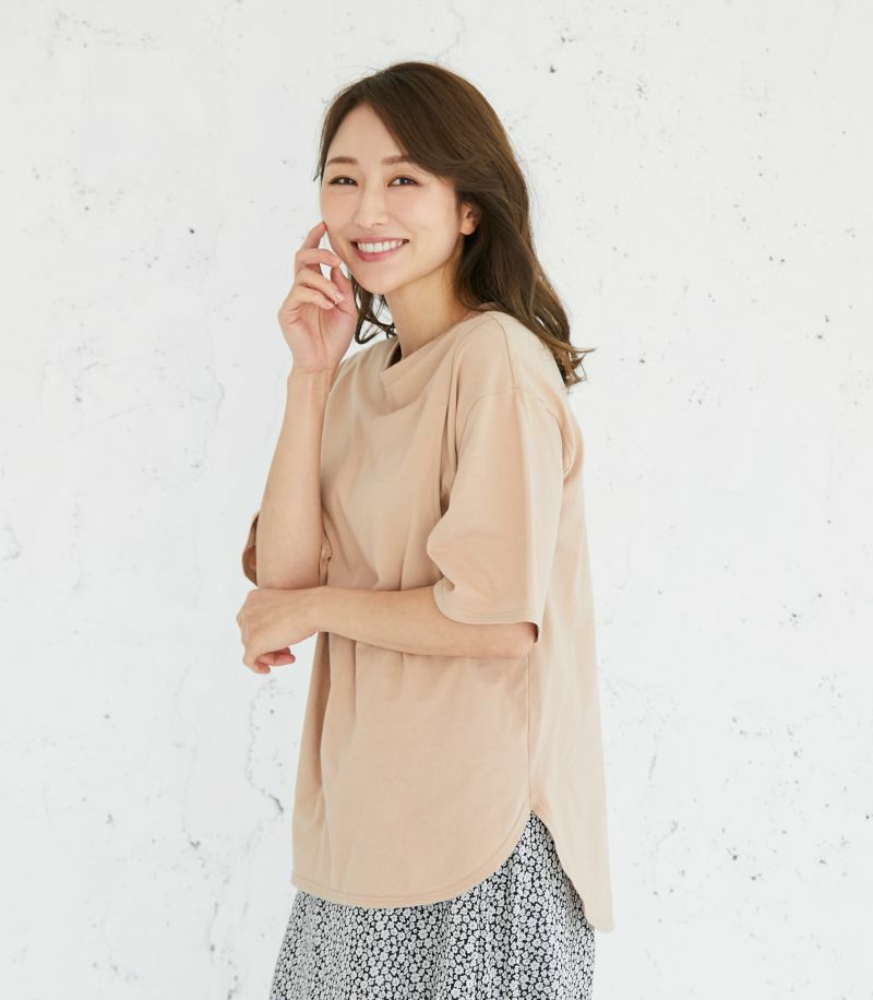 こなれ感のあるオーバーサイズのシンプルなTシャツは女性らしさにこだわったデザイン。長めの袖丈&着丈やラウンドカットの裾で着やせ効果も。やわらかなコットン100%素材のニュアンスカラーを揃えました。