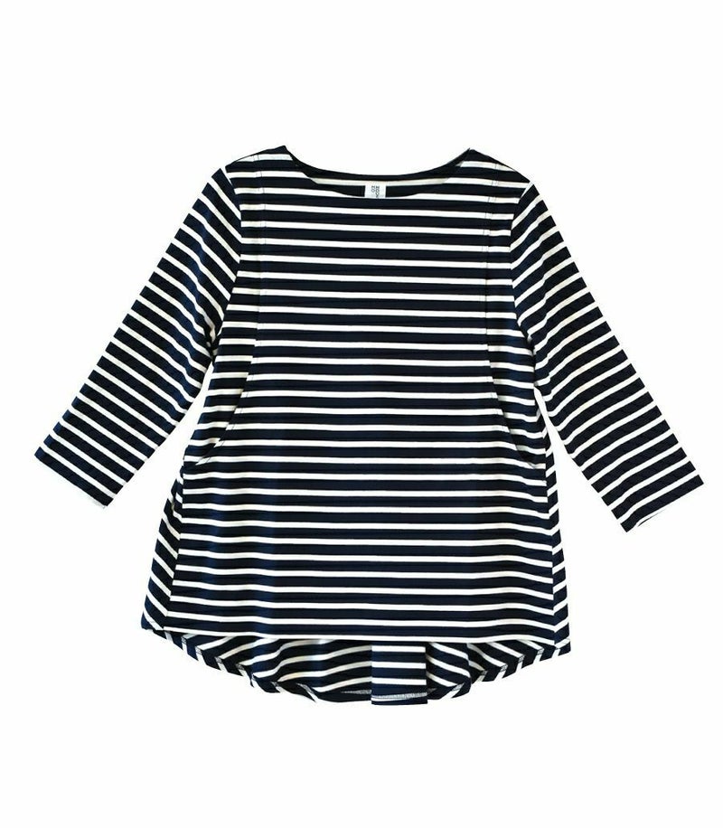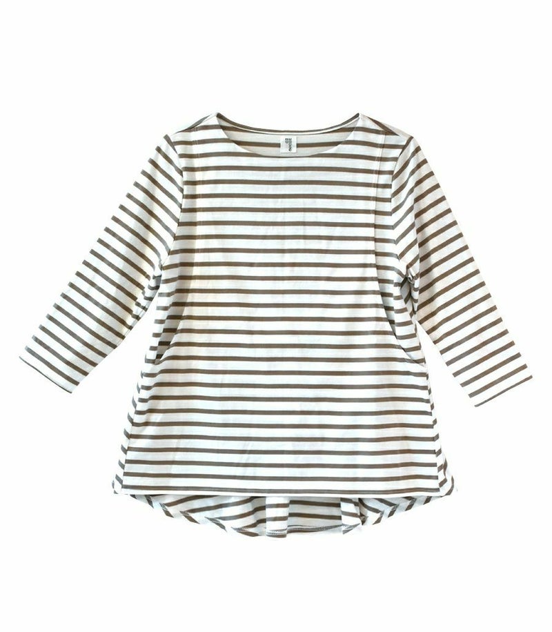 思っていたより薄手で、春〜夏用の服を探していたので良かったです。ベージュのボーダーが柔らかい印象で気に入りました。産後お尻が大きくなったと気にしているので、こちらは後ろの丈が長くなっているので安心です。