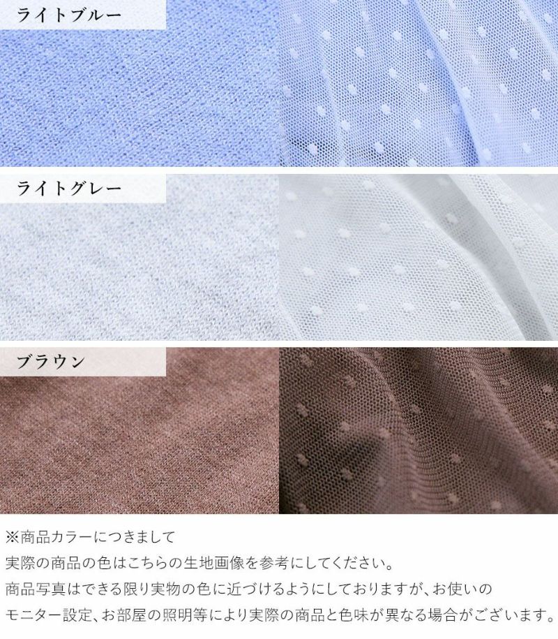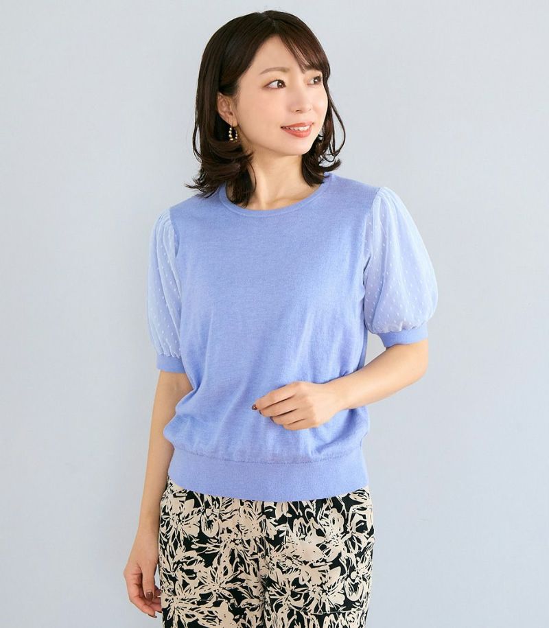 ドット柄チュール素材とニットコンビのトップス。程よいゆとりで身体のラインを拾わないシルエットです。ボリュームのある袖が気になる二の腕をカバーしてくれるのも嬉しいポイント◎ COLOR:ライトブルー/MODEL:164cm