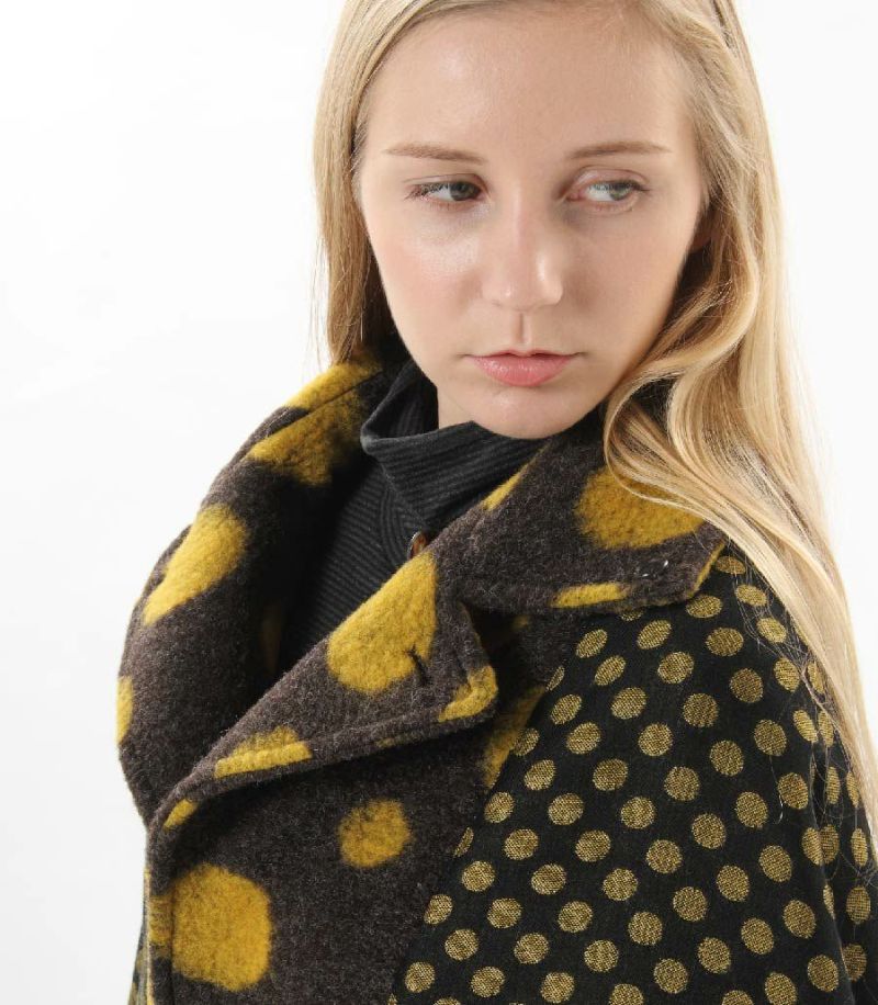 モコモコとした素材がとてもあたたかいフェルトウール。大小の黄色のドットがかわいらしくモード感のある素材です。裏にも小さいドットを使用しています。
