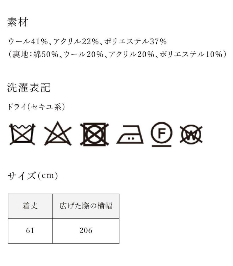 〈素材:ウール41%アクリル22%ポリエステル37%(裏地:綿50%ウール20%アクリル20%ポリエステル10%)〉