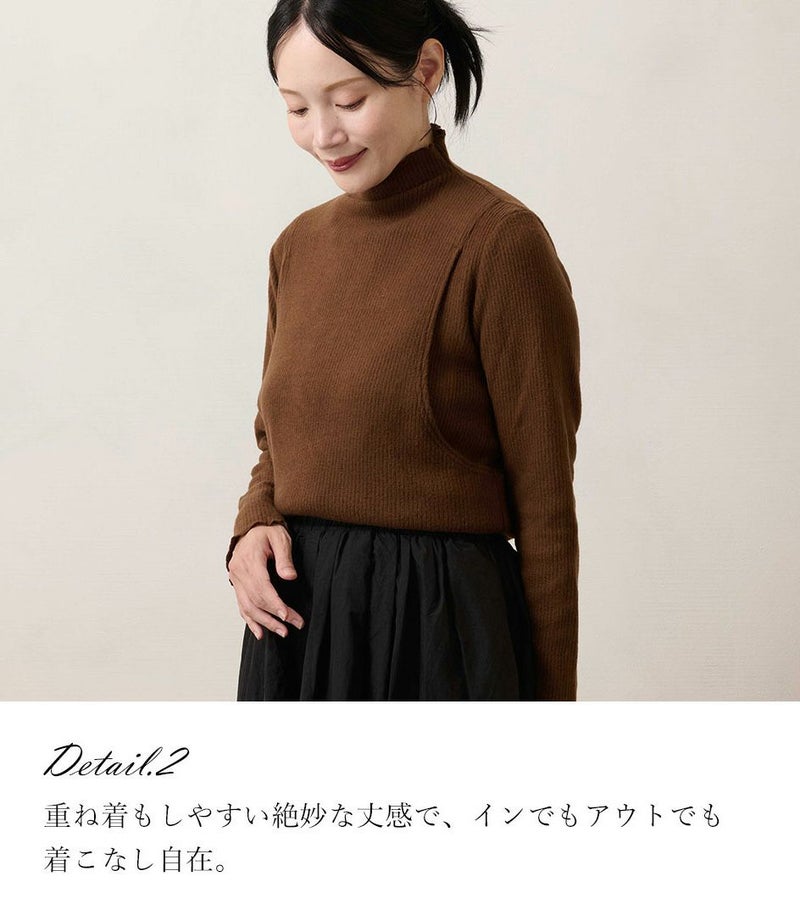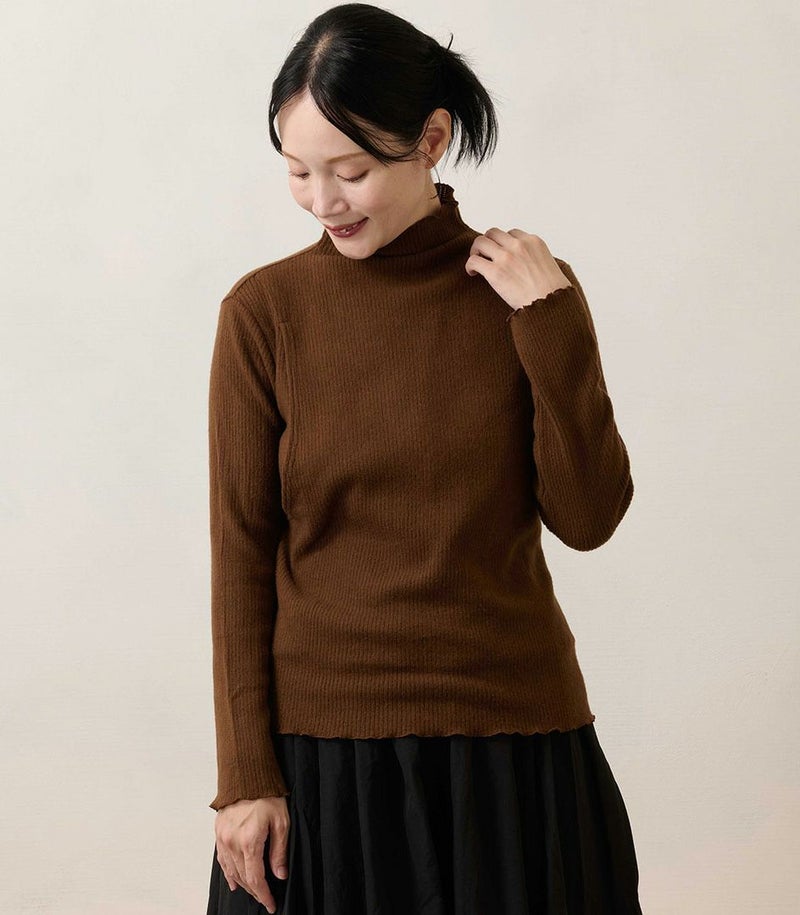 ウールのふんわり柔らかな肌触りで、寒い季節にぴったりのリブハイネックトップス。程よいフィット感がありながらも締め付け感はなく、柔らかな着心地です。シンプルで着回しやすく、デイリーからお出かけまで幅広く使える一着としておすすめです。 ●ポケット× 〈生産国:日本〉 〈素材:アクリル85%、ナイロン7%、ウール7%、ポリウレタン1%〉 アクリルの保温性・膨らみ、ナイロンの丈夫さ、ウールの暖かさが組み合わさった生地です。糸にボリュームを出すことでふんわりと柔らかい肌触りと軽量感があります。伸縮性もあり動きやすさも◎ 〈洗濯表記:洗濯機OK/ネット使用〉